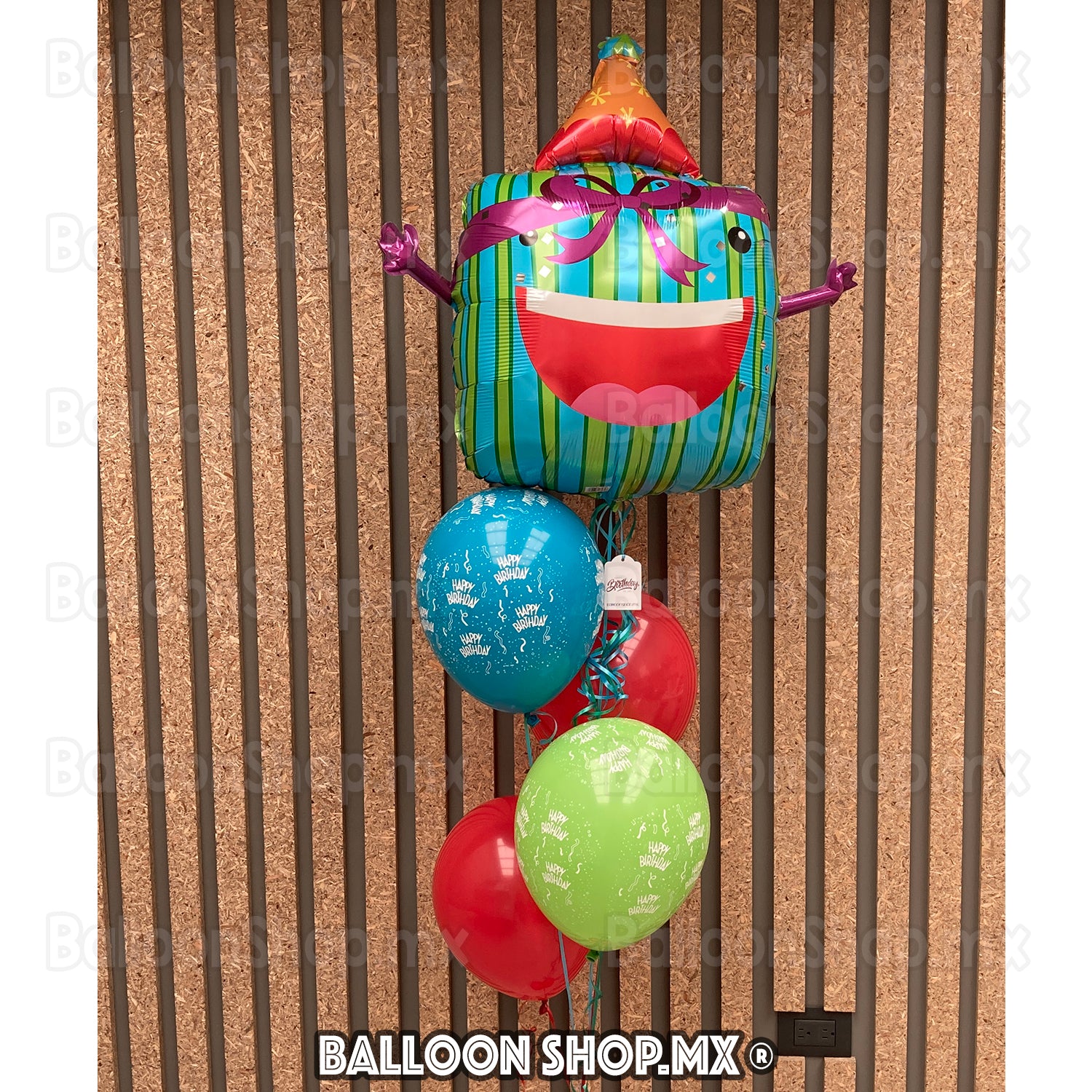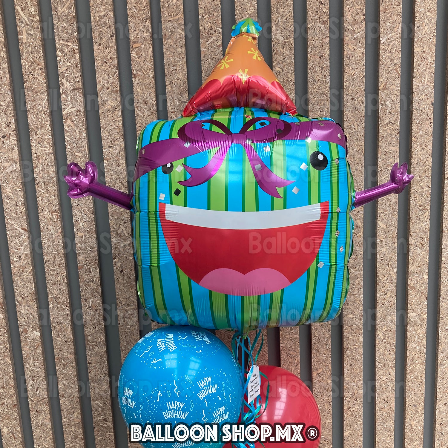 Globo cuadrado color verde con azul decorado con un moño color morado, en la parte superior trae un gorrito de fiesta y viene con dos bracitos extendidos.