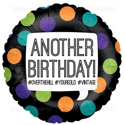 Globo redondo en color negro con circulos de colores azules, verdes, morados y naranjas. Al centro trae el icono de un mensaje con la frase "Another Birthday" y 3 hashtags.