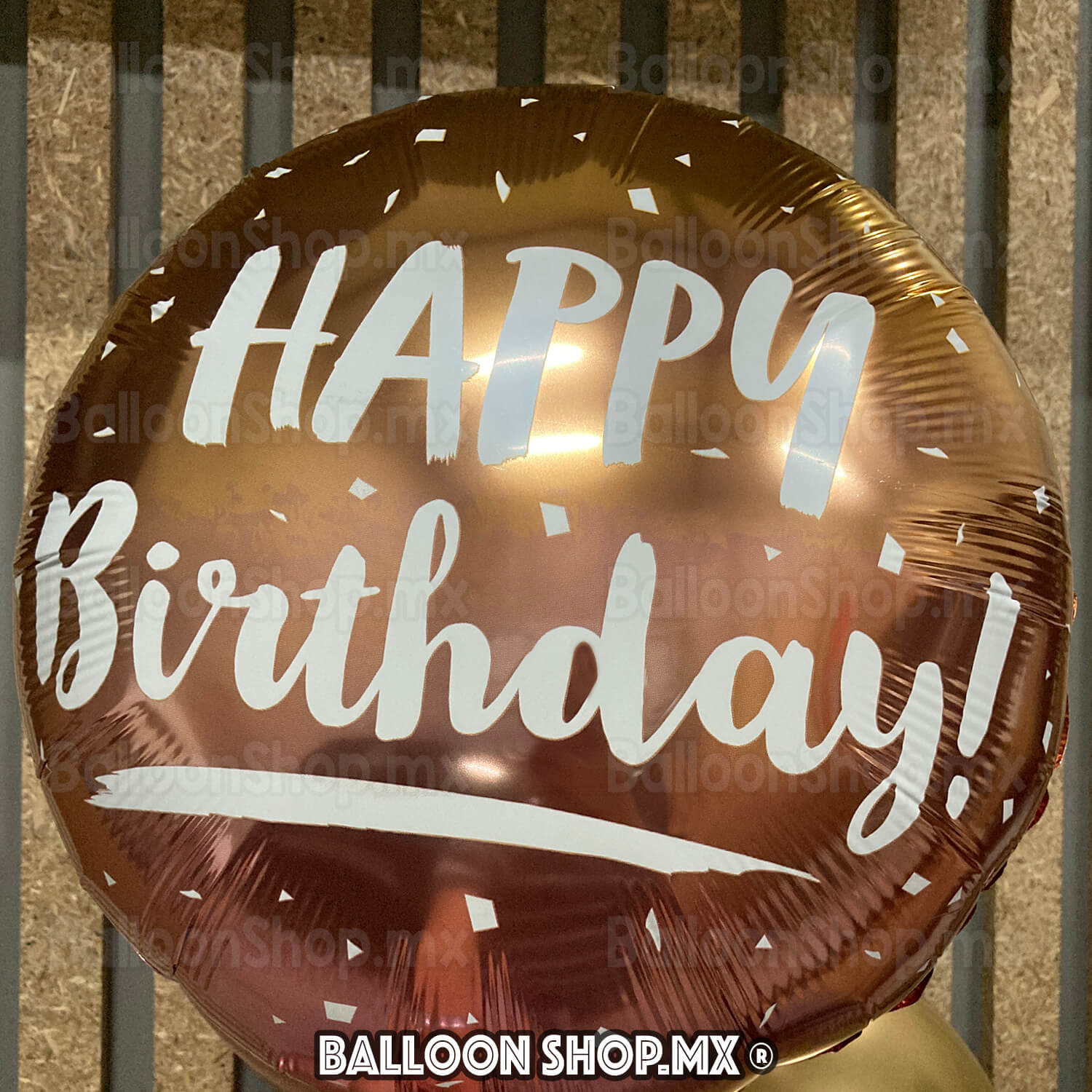 Globo redondo degradado comenzando por el color oro en la parte superior y bajando hasta el cobre en a parte inferior. Al centro la frase "Happy Birthday" en color blanco.