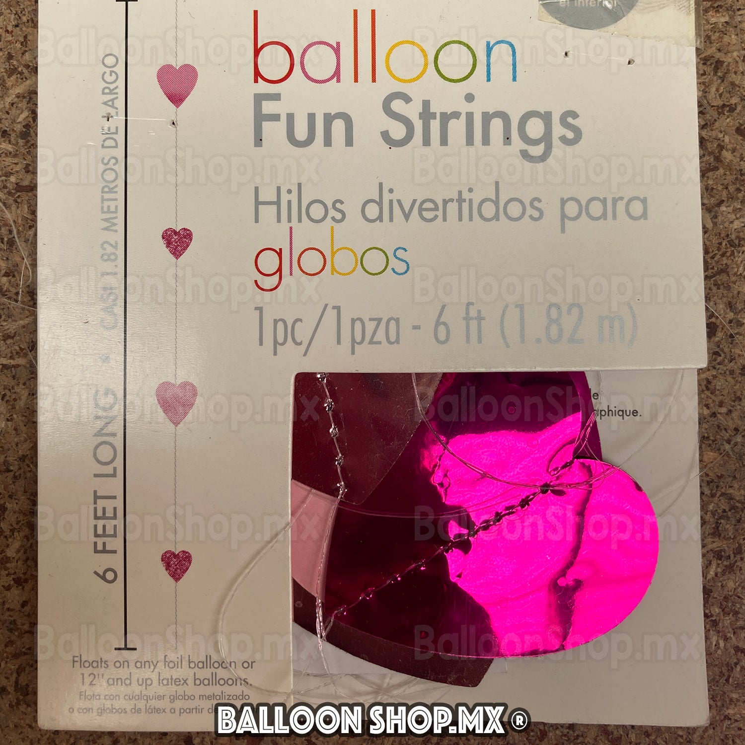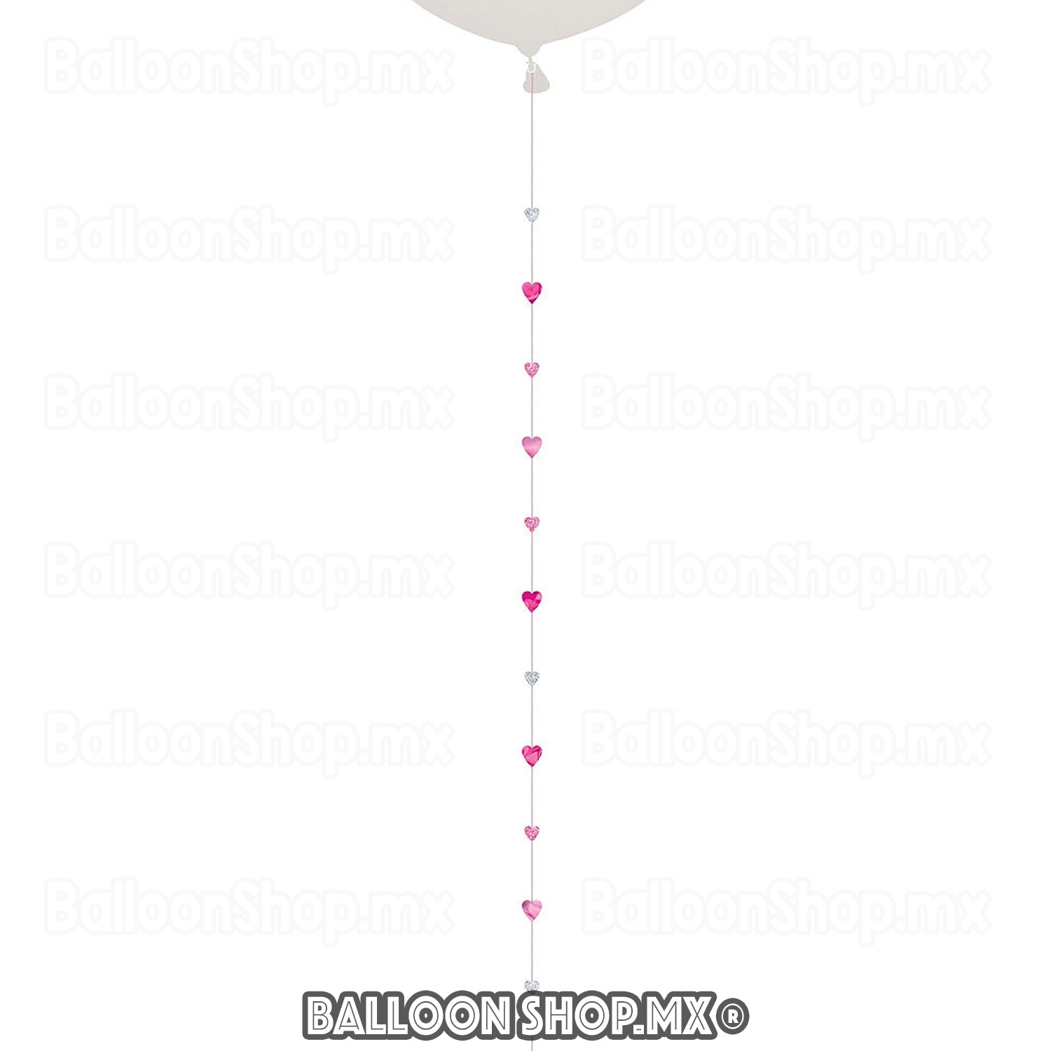 Hilo premium con pequeños corazones de colores rosas a todo lo largo. El hilo cubre desde el nudo del globo hasta el contrapeso.