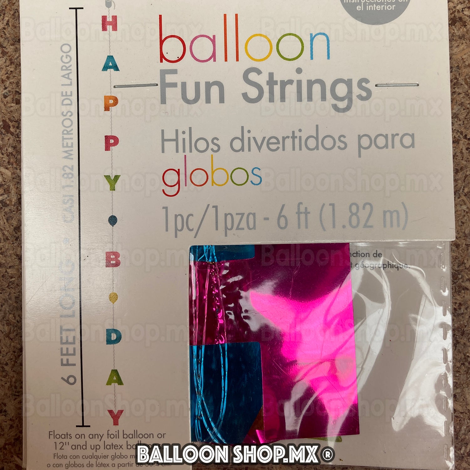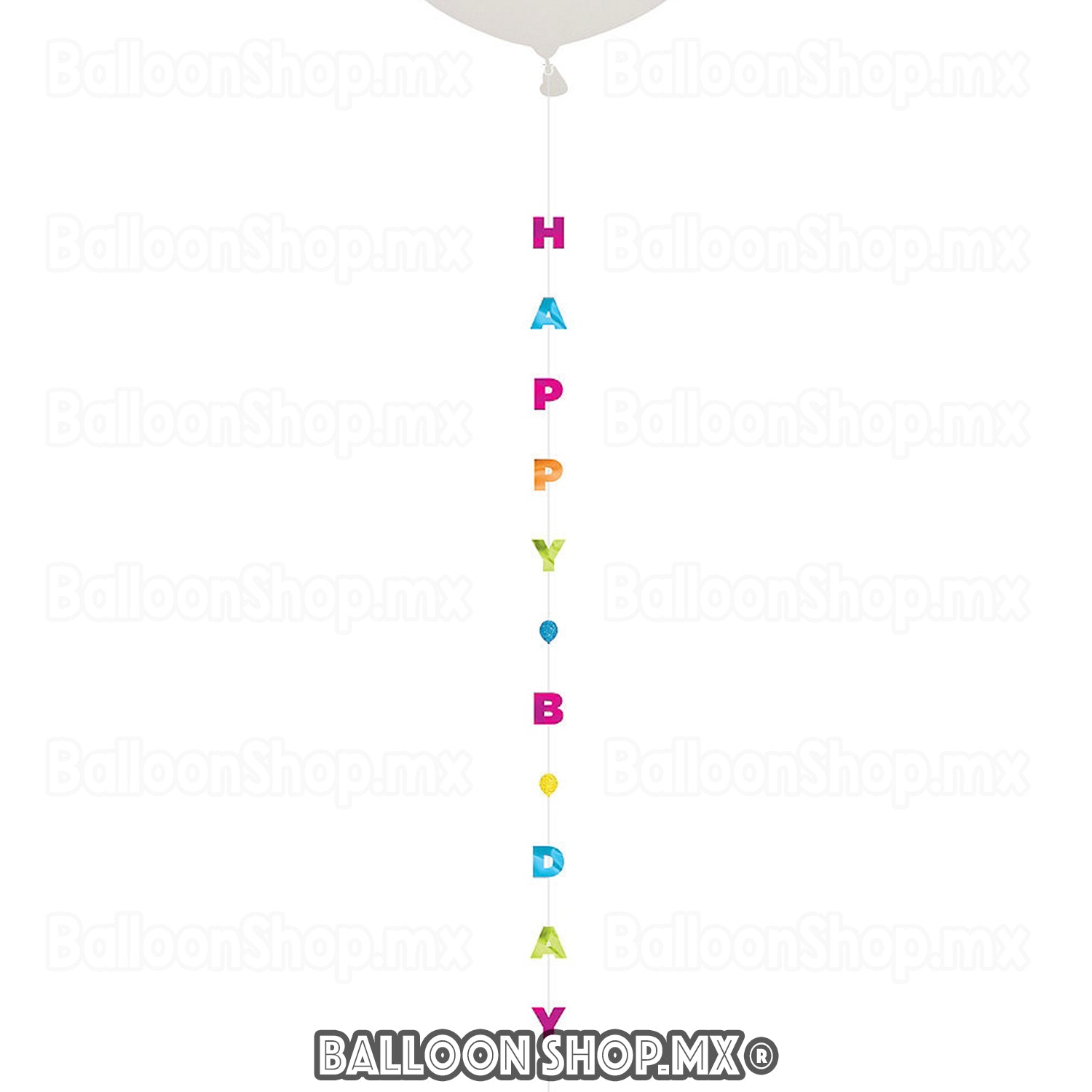 Hilo premium con la frase "Happy Bday" a todo lo largo en colores joya con acabado metálico. El hilo cubre desde el nudo del globo hasta el contrapeso.