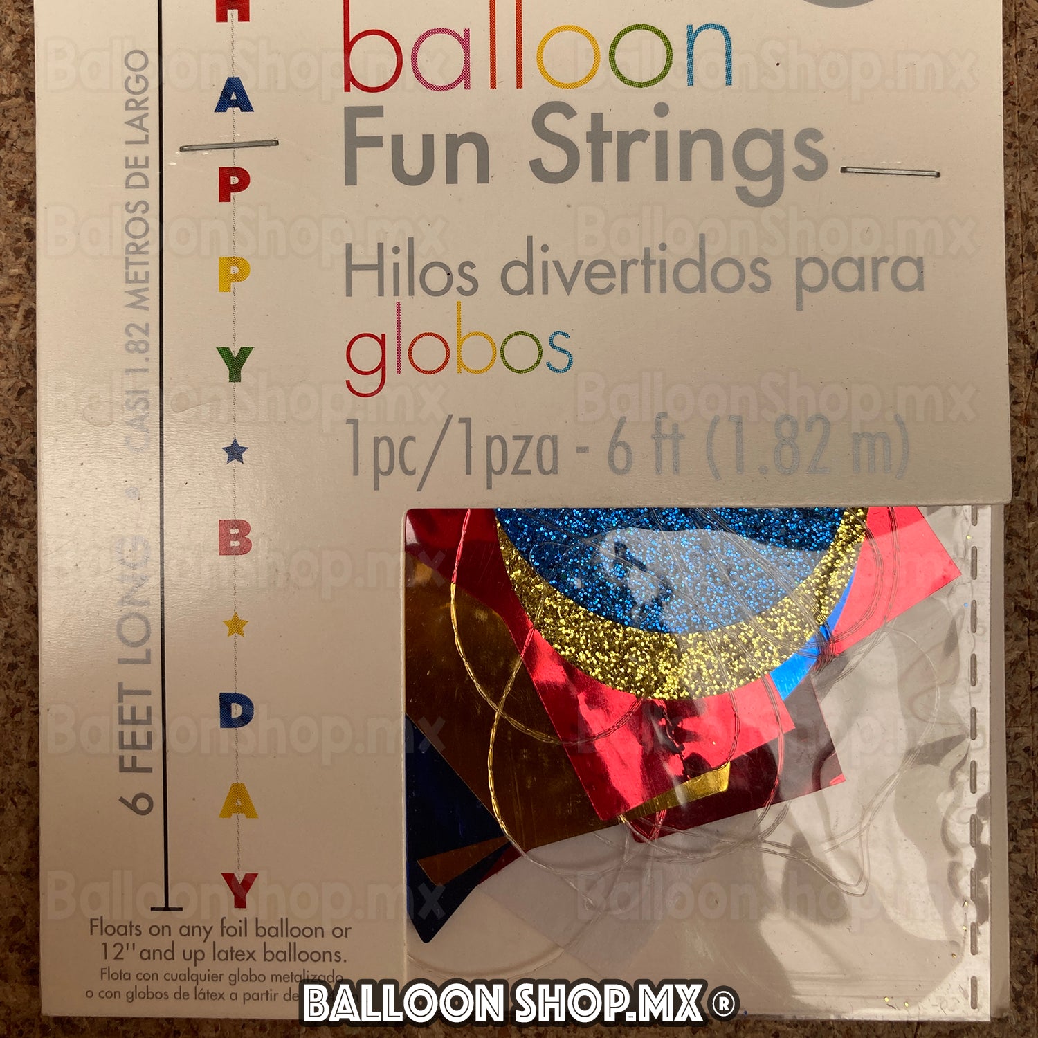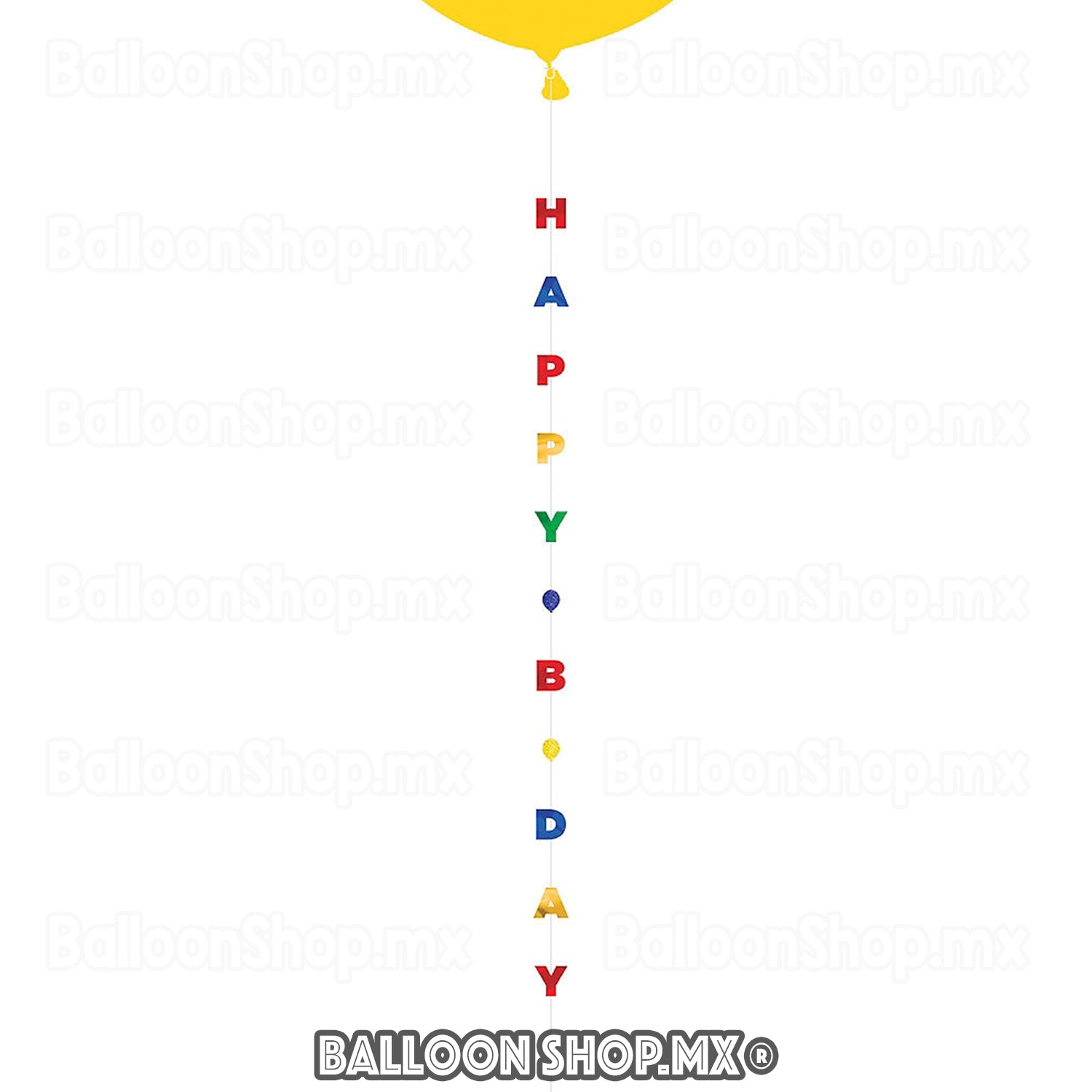 Hilo premium con la frase "Happy Bday" a todo lo largo en colores primarios con acabado holográfico. El hilo cubre desde el nudo del globo hasta el contrapeso.