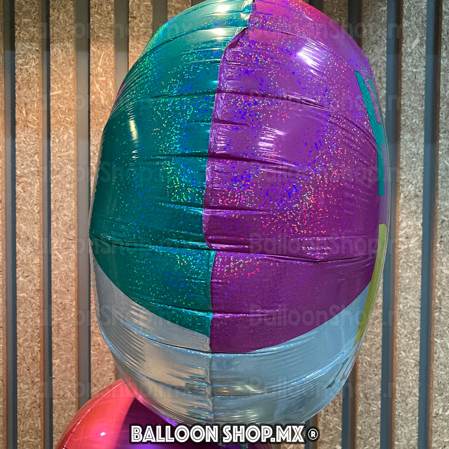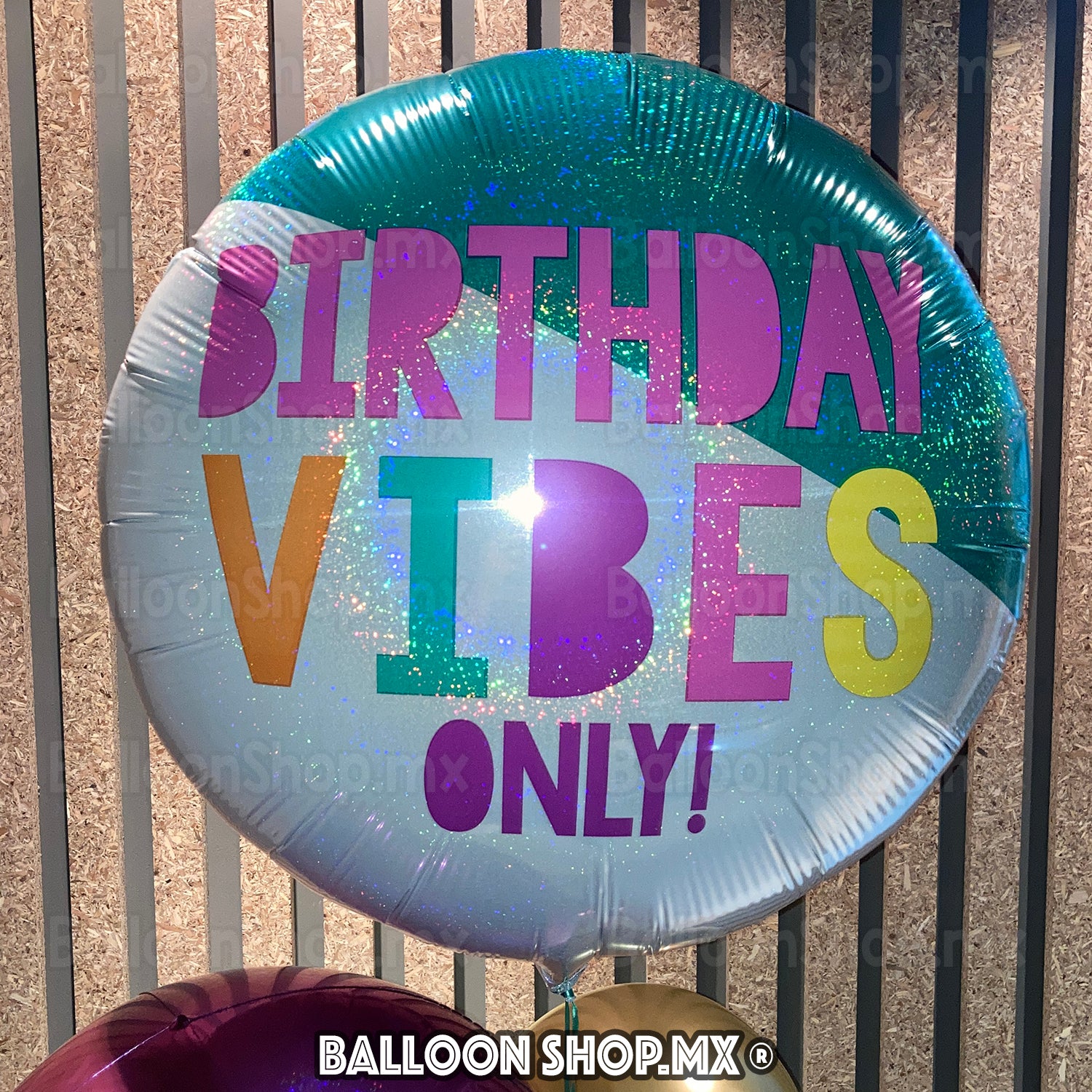 Globo redondo en acabado holográfico que con el movimiento y la luz generan destellos de colores. Cuenta ademas con un diseño diferente para cada caras, en la primera tiene los tonos plata y rosa de fondo y la frase "Happy B-day i can't adult today" y por la otra cara tiene la frase "Birthday Vibes only" con colores plata y verde de fondo.