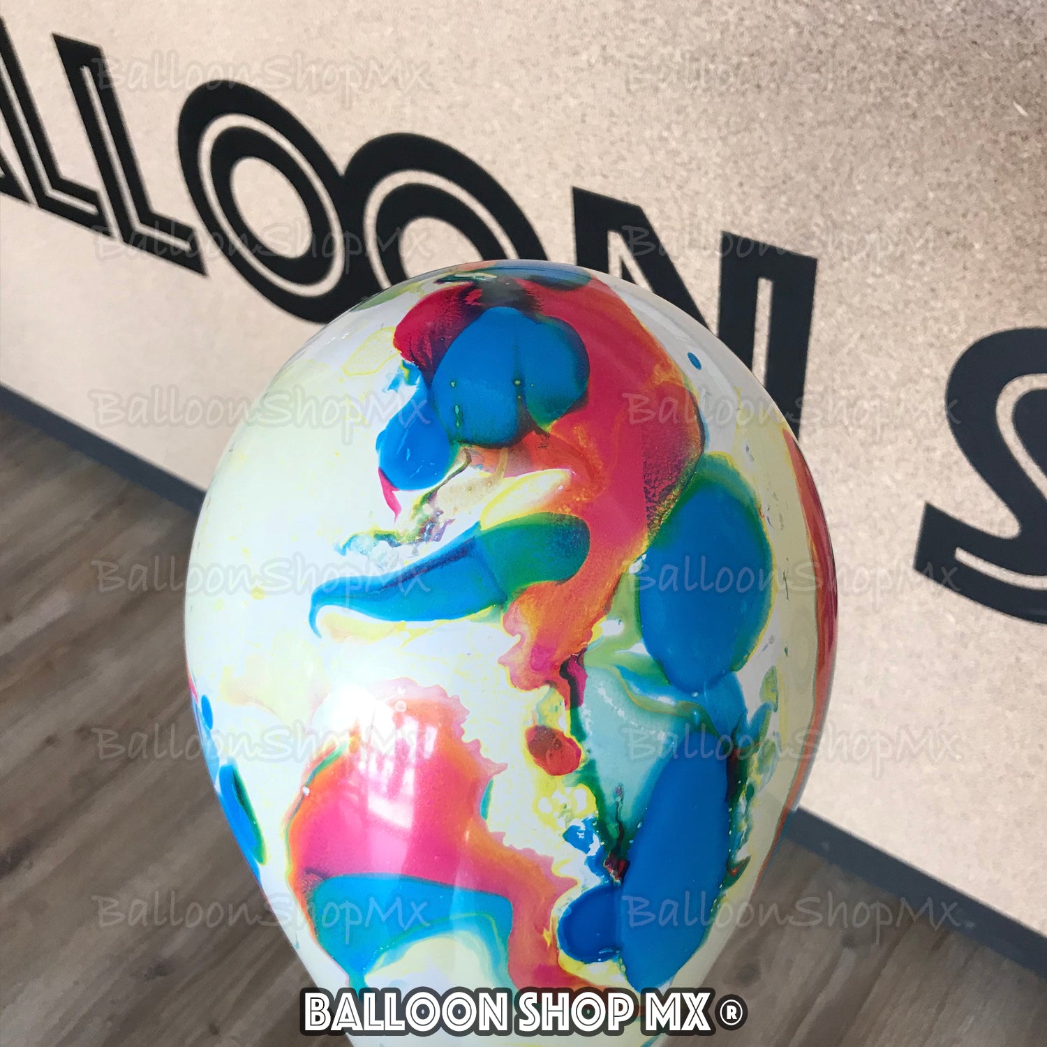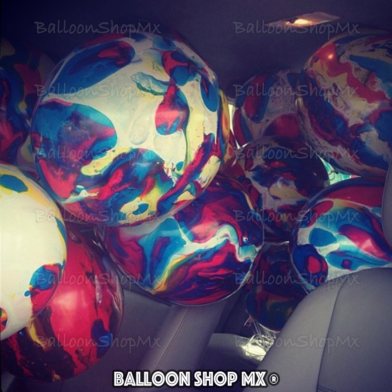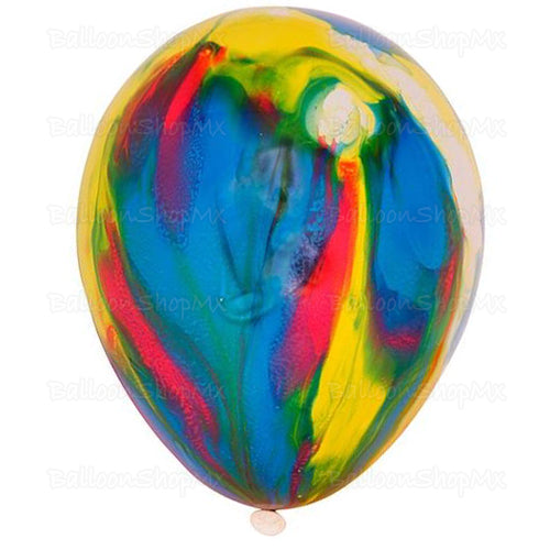 Globo en acabado marmoleado con una mezcla de colores azul, amarillo, rojo y blanco; estos globos son tratados de una forma especial por lo que no hay dos piezas con el mismo patrón de vetas. Mide 25 cm de diámetro en la zona más ancha. Todos nuestros globos de látex son 100% naturales y biodegradables, se fabrican a partir de la savia de árboles de caucho, sustancia completamente orgánica y totalmente biodegradable.