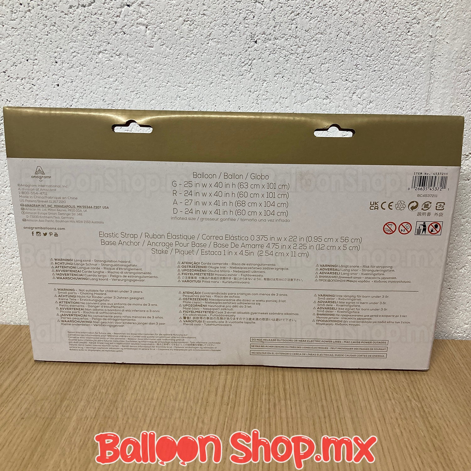 La frase GRAD formada por letras en tamaño jumbo. Cada letra viene de forma individual con base, las letras son de color blanco con estrellas doradas y negras y la base viene en color degradado de negro y dorado. Estas letras pueden ser usadas en interior o exterior, formando una decoración de casi 3 metros de ancho.