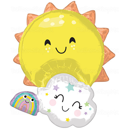 Globo con un sol gigante sonriente, una nubecita blanca con estrellitas también sonriendo y un arcoíris a un costado.
