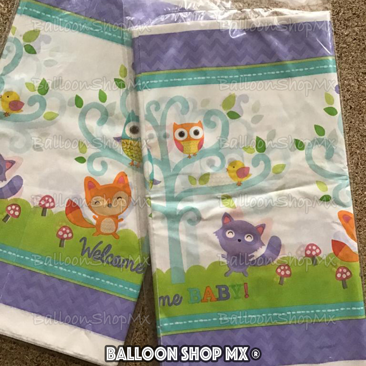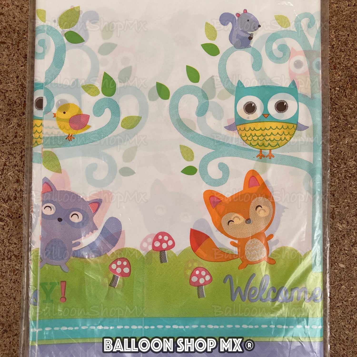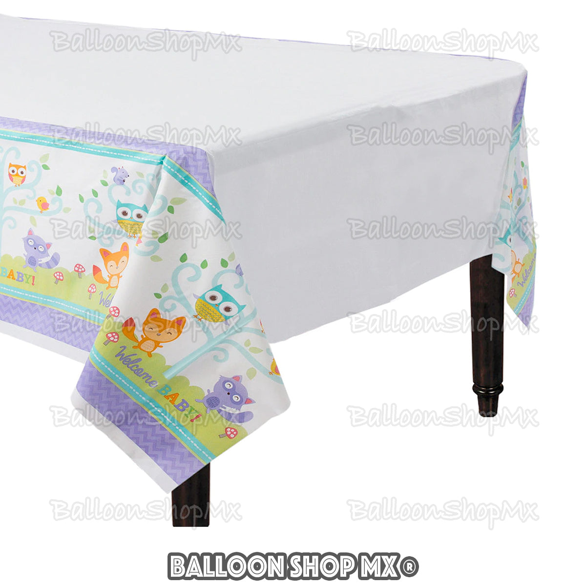 Mantel para Baby Shower con decoración de los animalitos del bosque (tenemos globos de esta misma temática). A los costados vienen estos personajes acompañados de la frase "Welcome Baby" , al centro viene liso en color blanco.