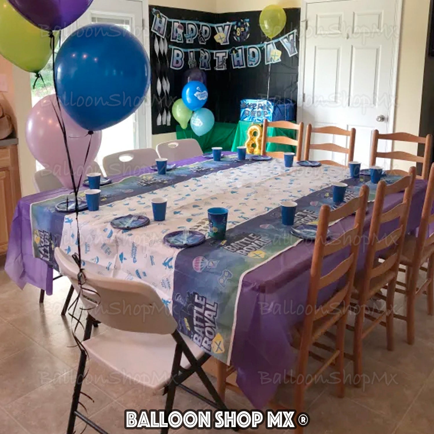 Mantel de Battle Royal, a los costados trae impreso el logotipo característico con el fondo degradado, y al centro con el fondo blanco trae imágenes en color azul de llamas piñatas, controles de videojuegos, paracaídas, etc.