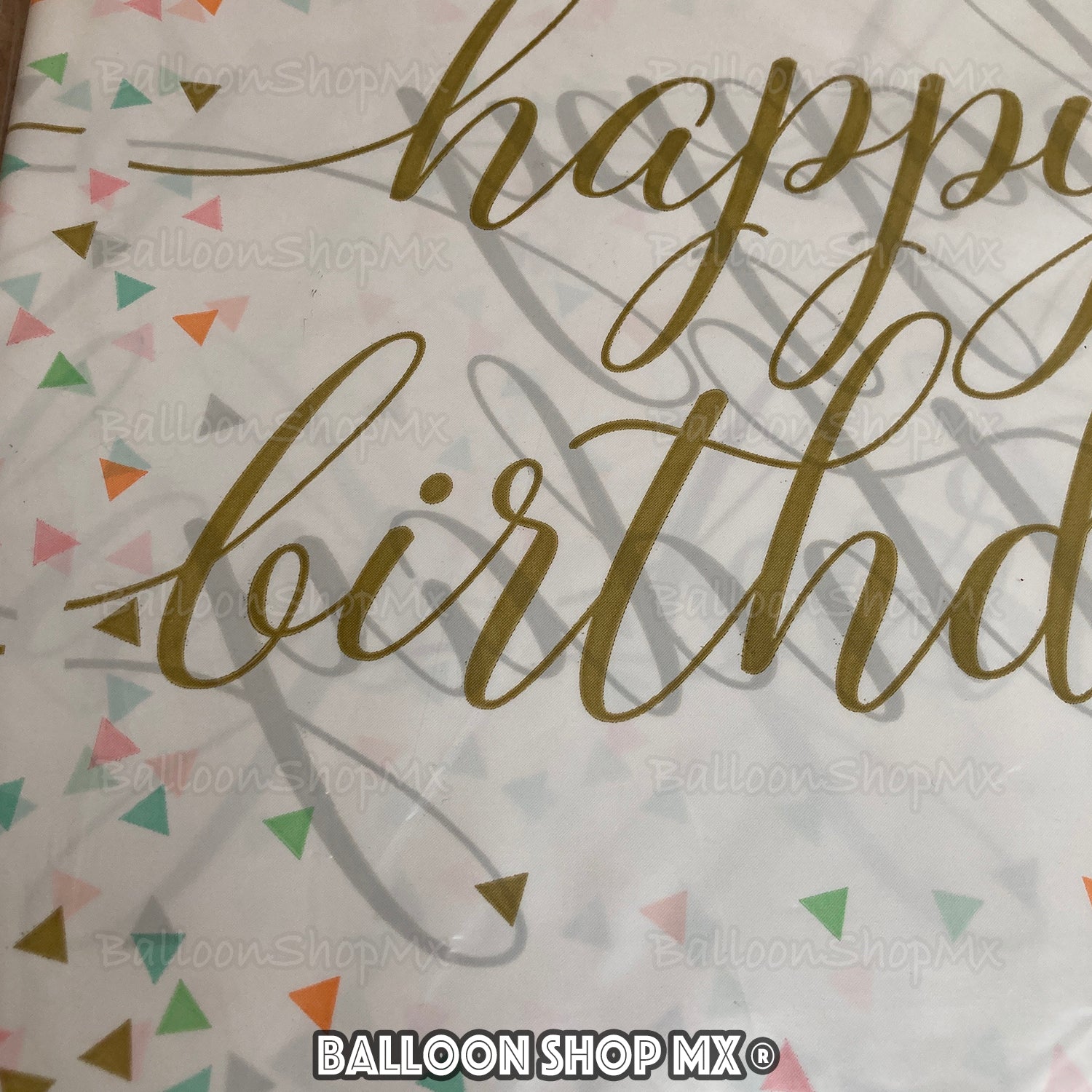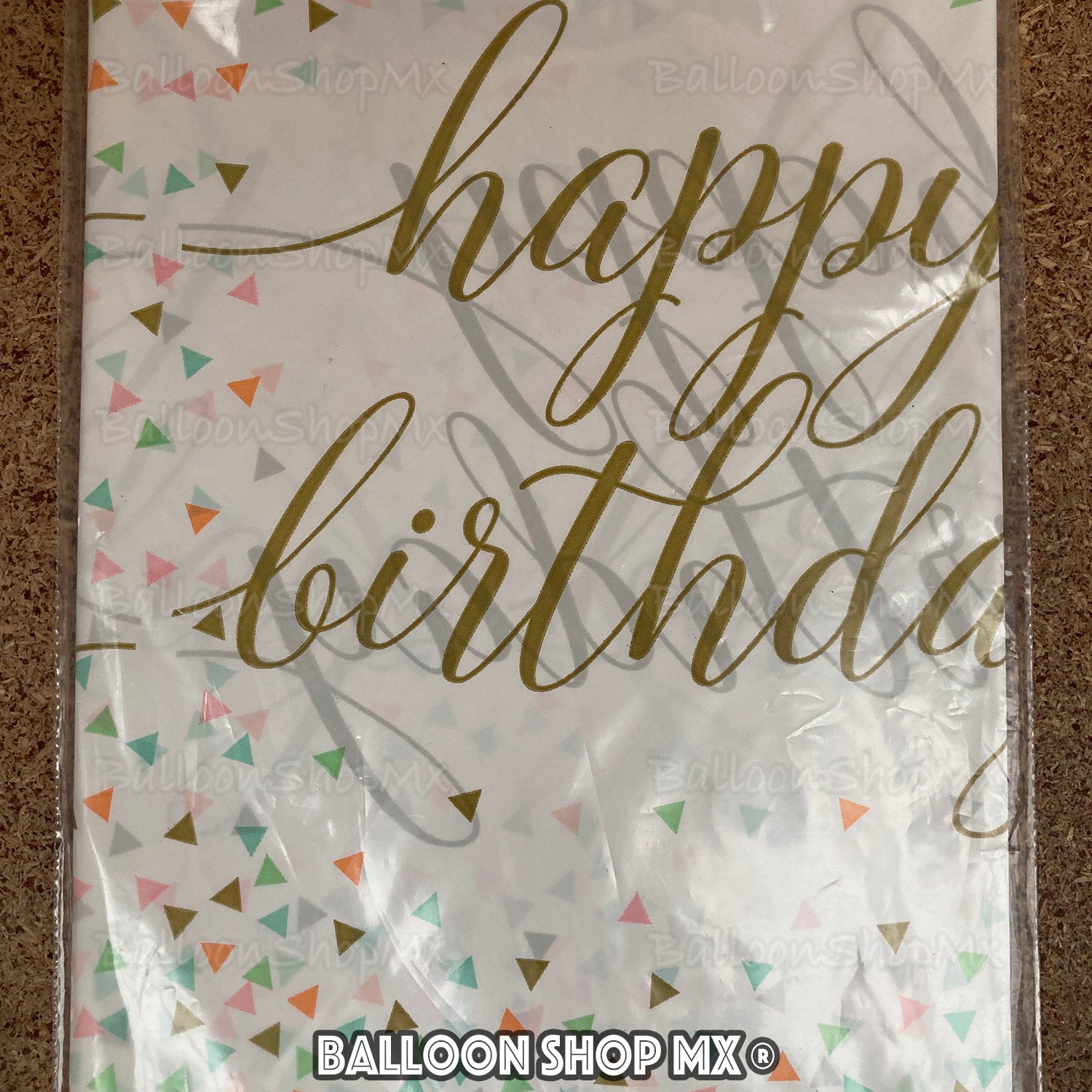 Mantel de cumpleaños en color blanco, a los costados trae dos franjas doradas que envuelven un decorado de triángulos de confeti de colores y la frase "Happy Birthday".