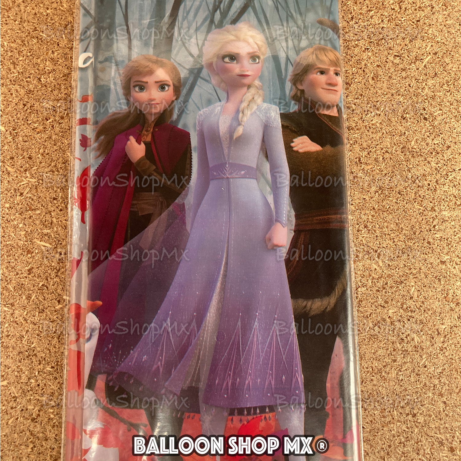 Mantel de Frozen 2, a los bordes trae a los personajes Elsa, Anna, Kristoff y Sven. El centro del mantel viene en color azul con un decorado de hojas en un tono de bajo contraste.
