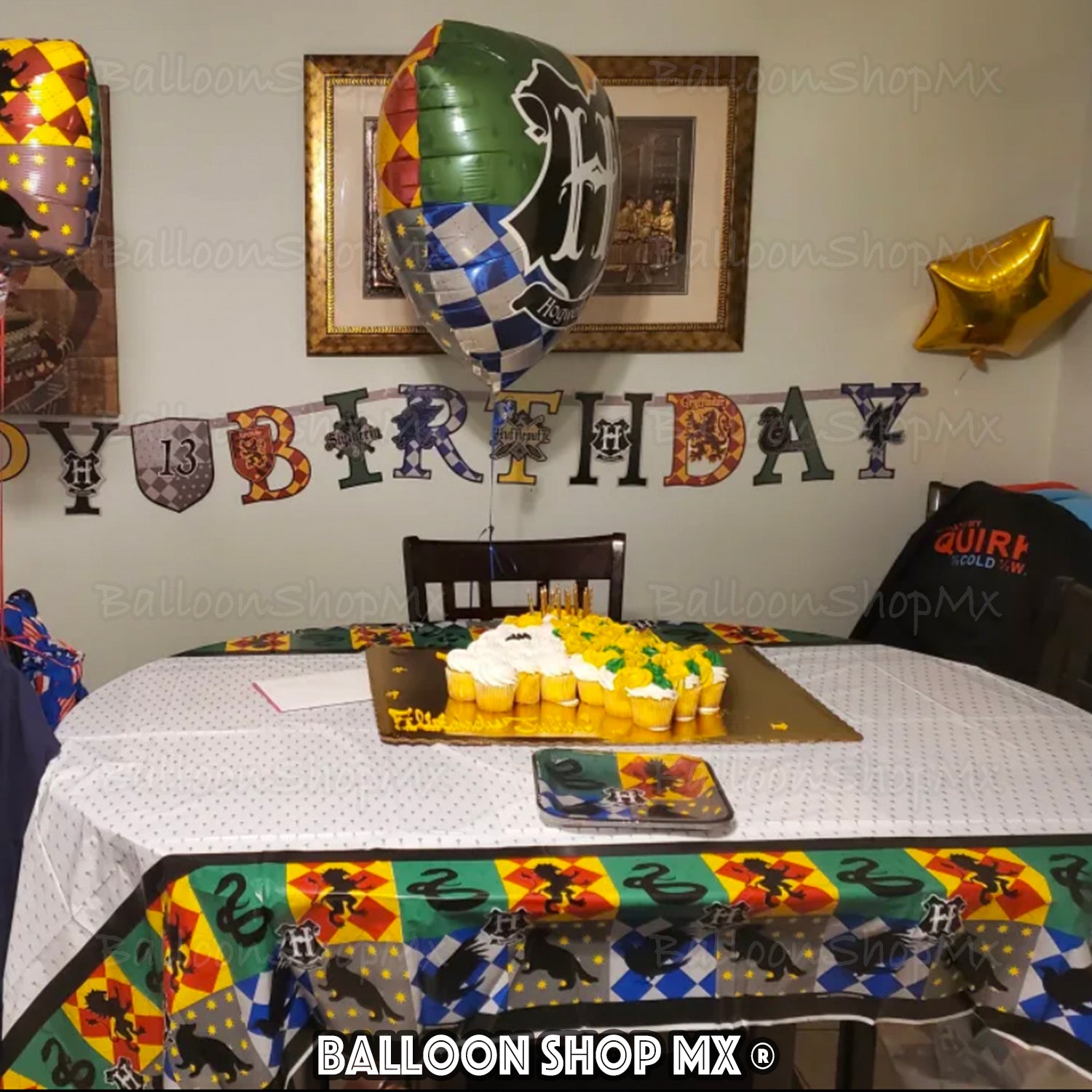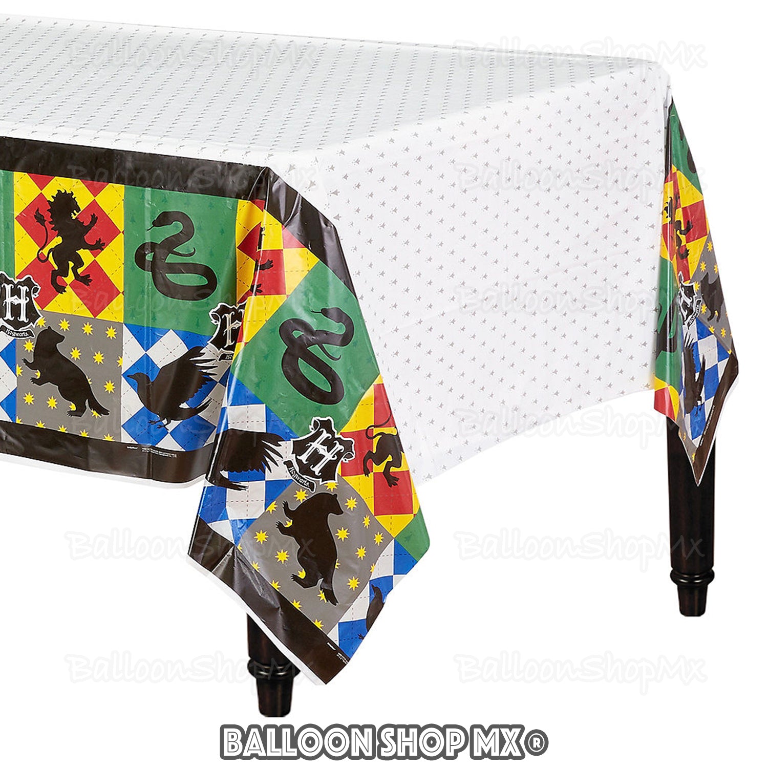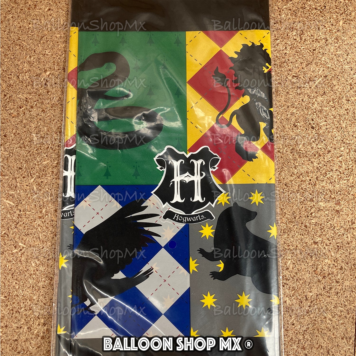 Mantel de Harry Potter decorado a lo largo en sus bordes con los escudos de las 4 casas de Hogwarts, Gryffindor, Hufflepuff, Ravenclaw y Slytherin. Al centro viene en color blanco con símbolos en color gris.