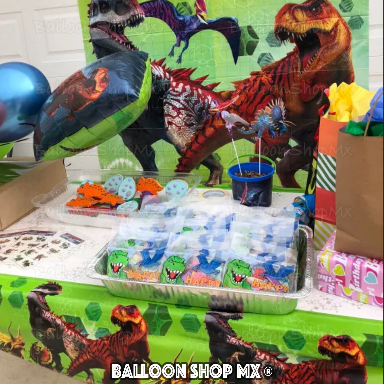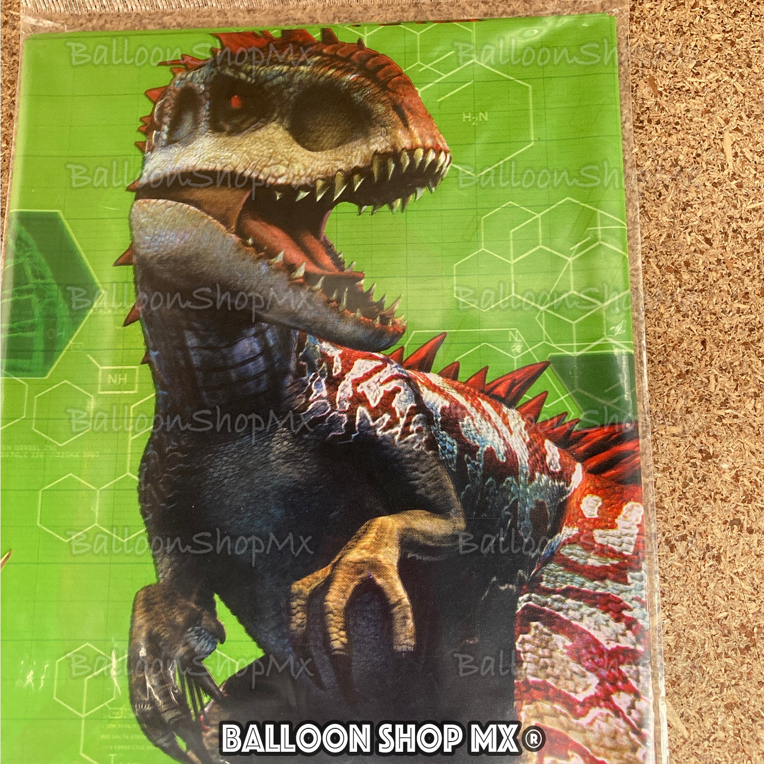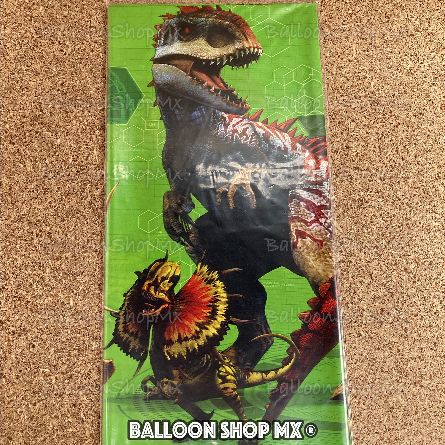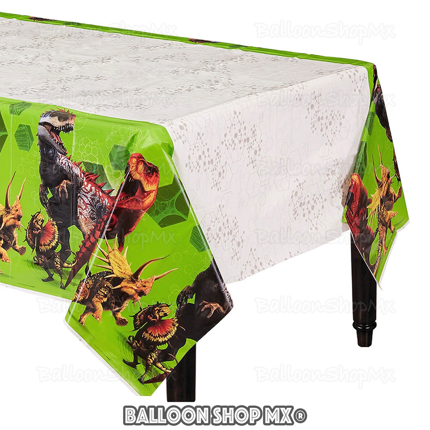 Mantel de Mundo Jurásico decorado a lo largo en sus bordes con los dinosaurios de esta pelicula, como lo es el T-rex, Indominus, Triceratops, etc. Al centro es de color blanco y trae un diseño simulando cadenas de ADN.