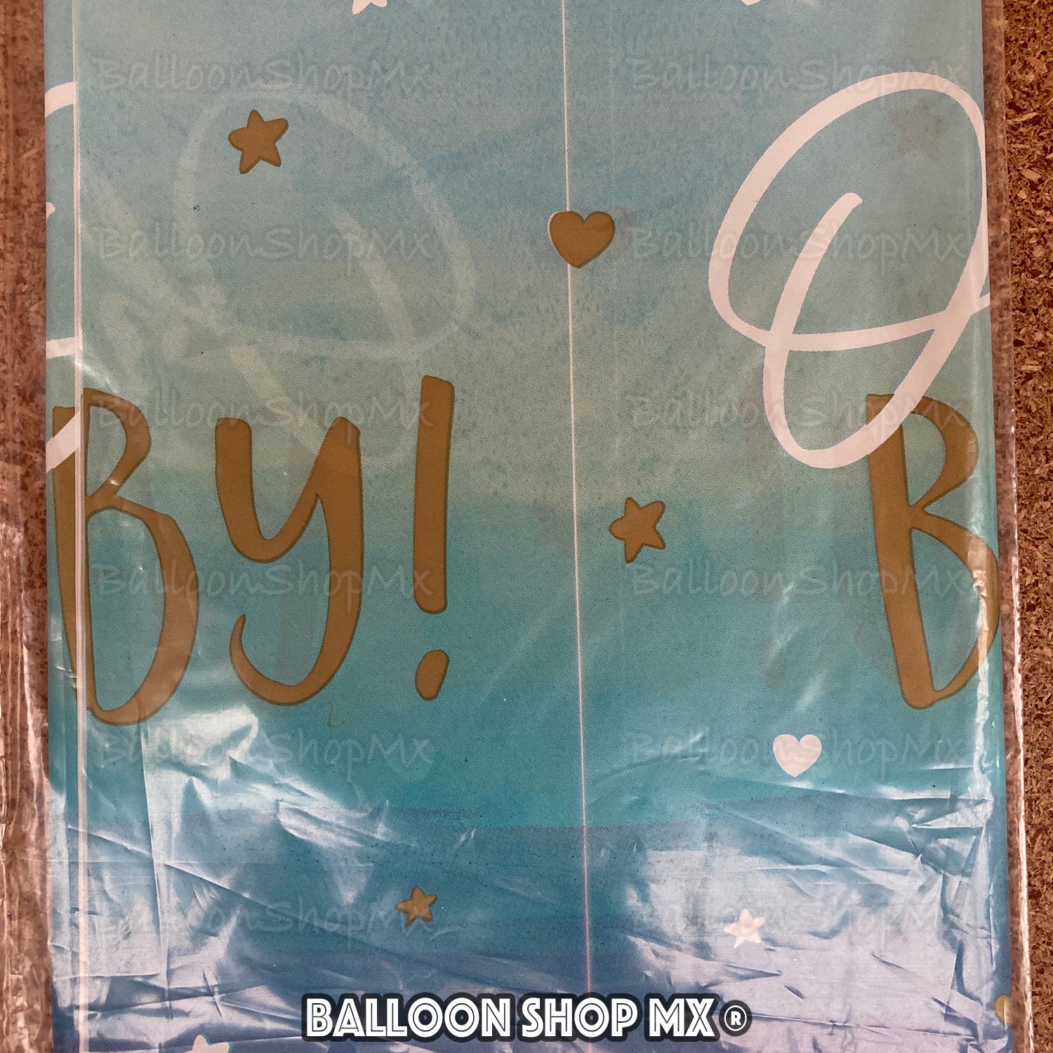 Mantel para Baby Shower decorado con la frase "Oh Baby!" en letras blancas y dorada con un fondo en azul degradado al contorno del mantel, el centro viene liso en color blanco.