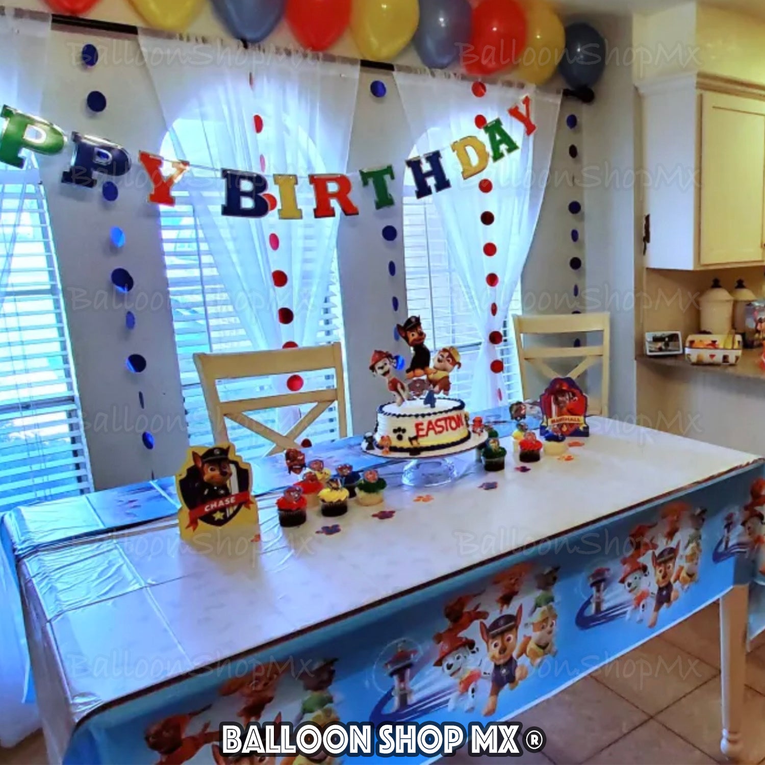Mantel de Paw Patrol decorado a lo largo con los personajes de la caricatura, al centro viene en color blanco con huesitos, huellas y otras figuras en color azul.