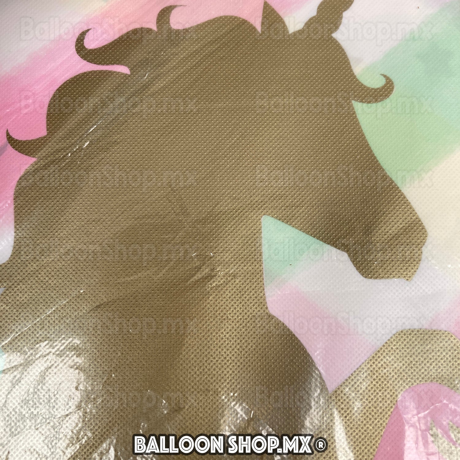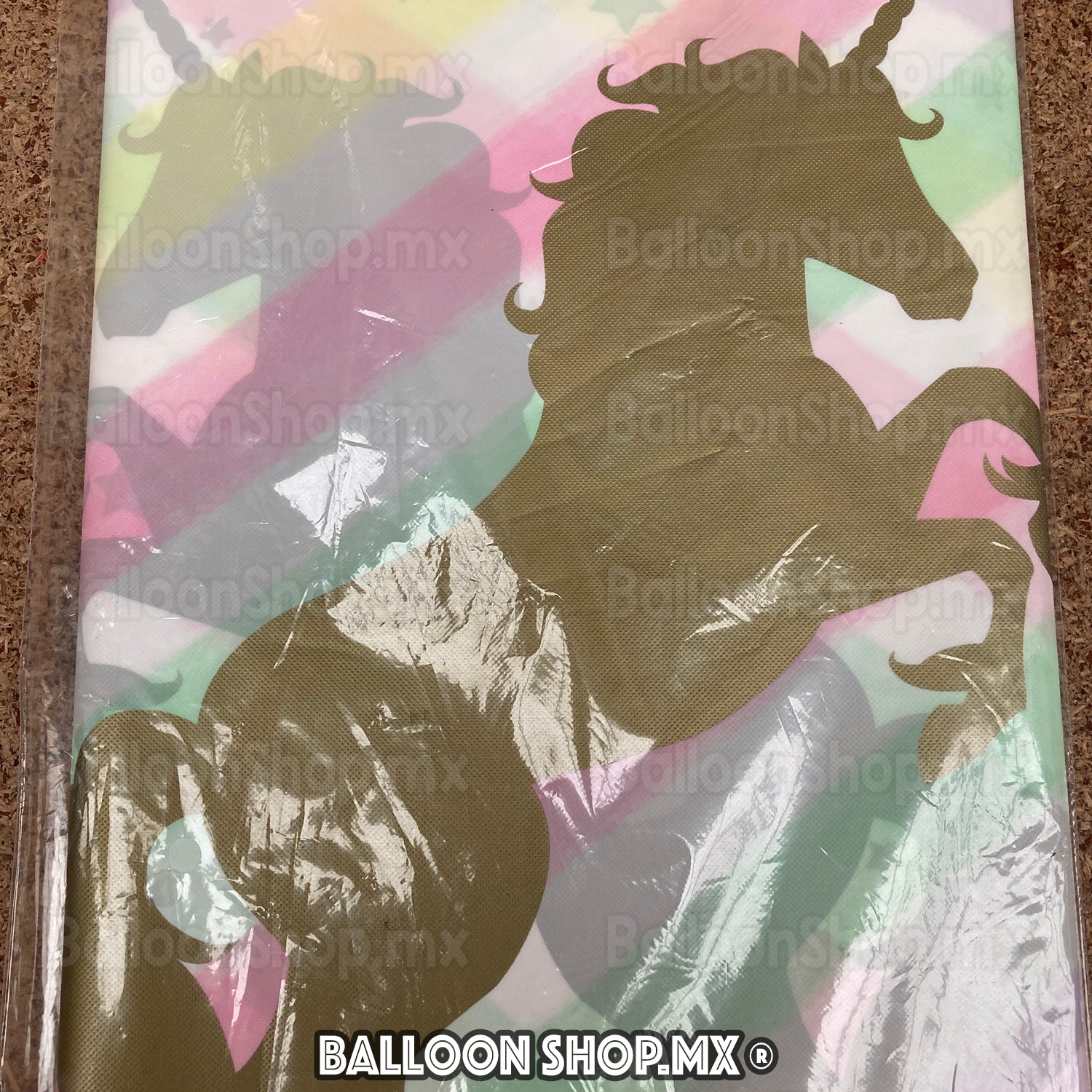 Mantel de unicornio decorado con siluetas de unicornio en color dorado a lo largo de todo el costado con un fondo de rayas en colores de arcoíris. Al centro viene decorado con estrellas de los mismos colores pastel.