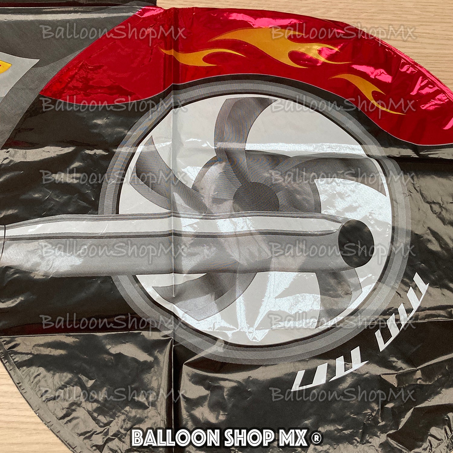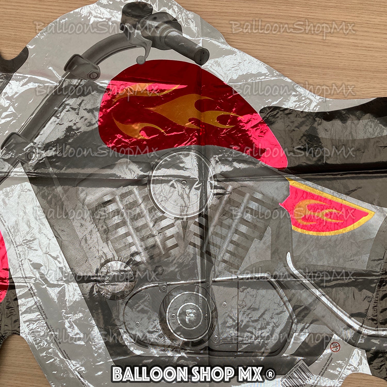 El globo perfecto para un biker, este diseño tipo Harley viene con el tanque y los guardafangos en color rojo decorados con llamas de color naranja, el motor y otras piezas vienen en color acero; el escape y algunos detalles del motor vienen en acabado cromado.