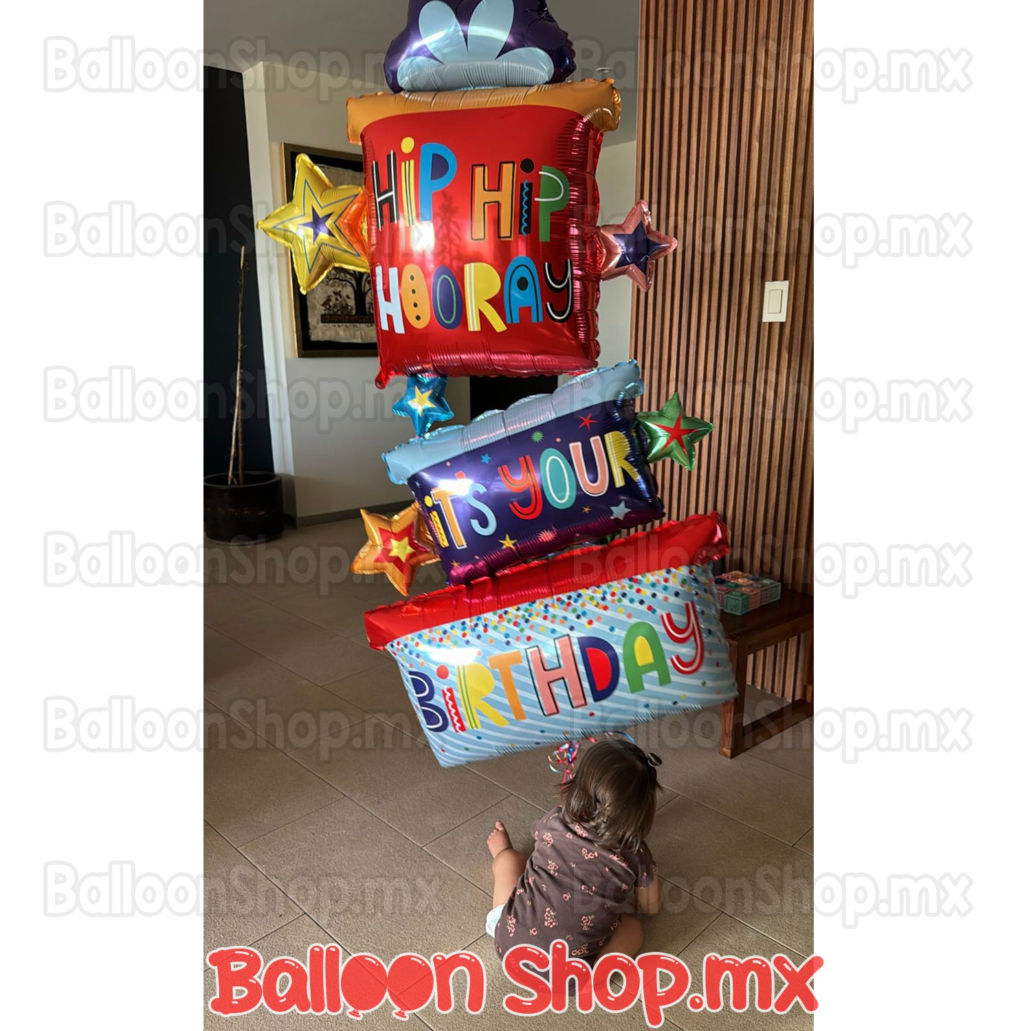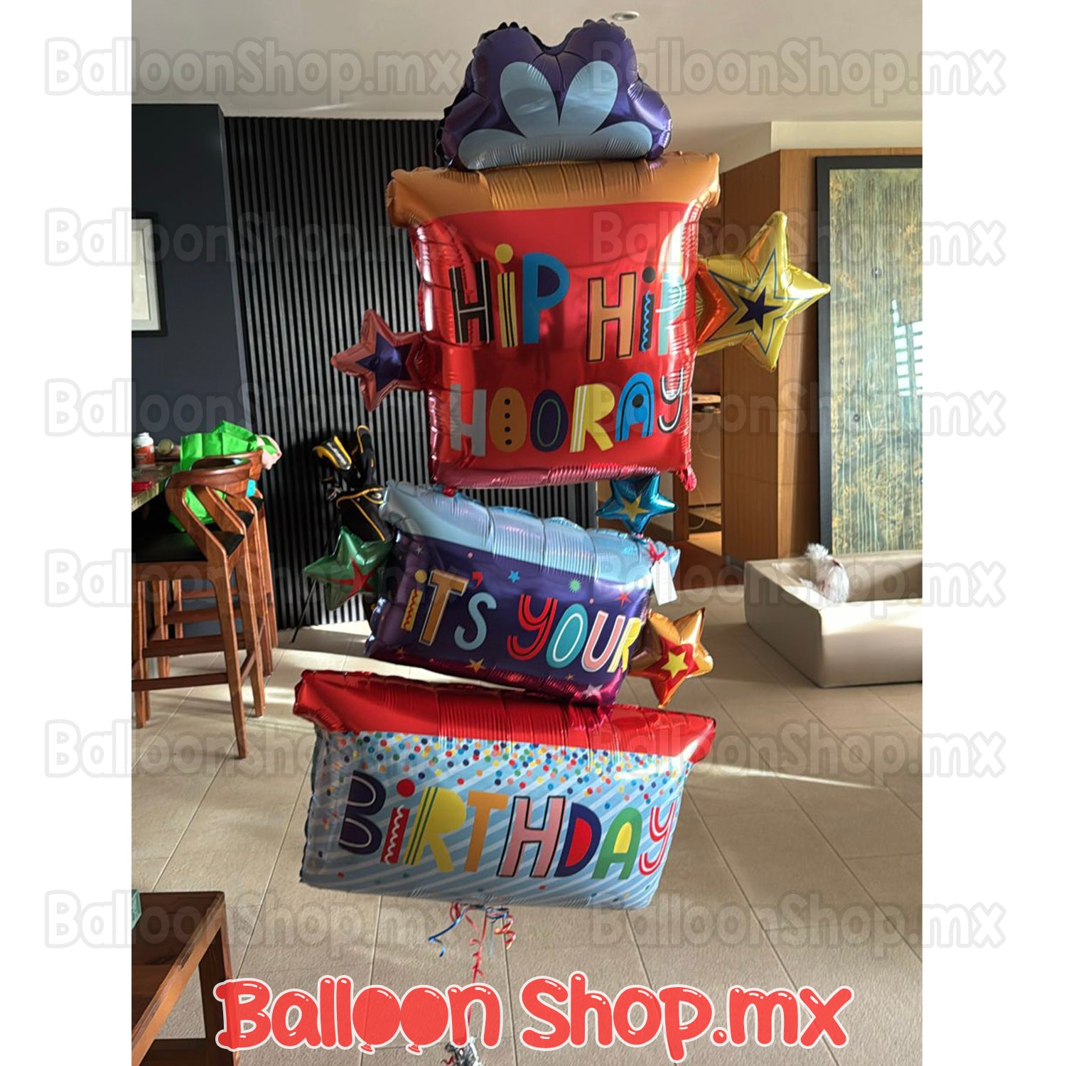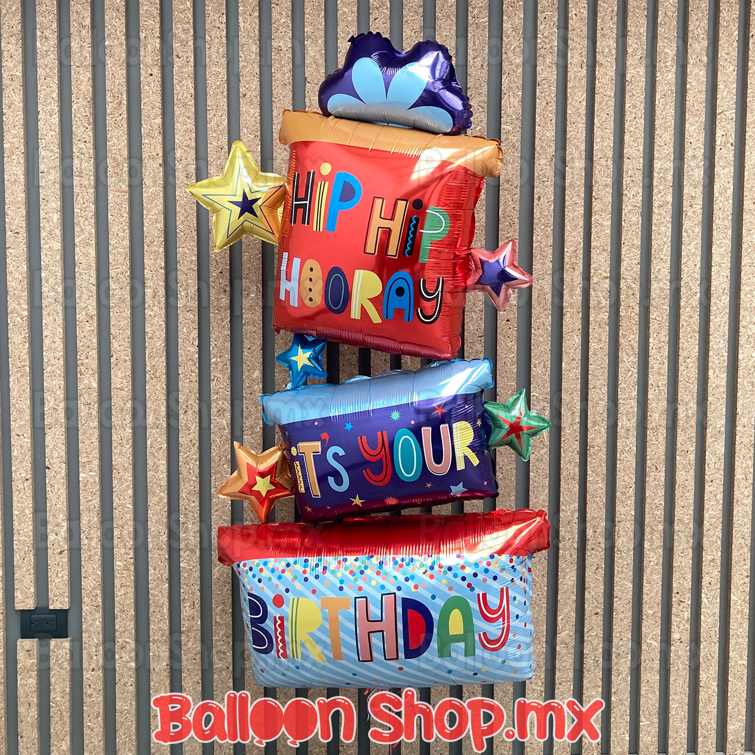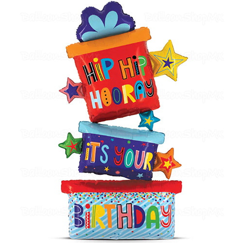 Globo gigante con la forma de tres cajas de regalo apiladas, en ellas la frase "hip hip hooray, it's your birthday" en letras de colores. El globo trae ademas unas estrellas de decoración. Este globo es enorme, ¡1.45m de alto!