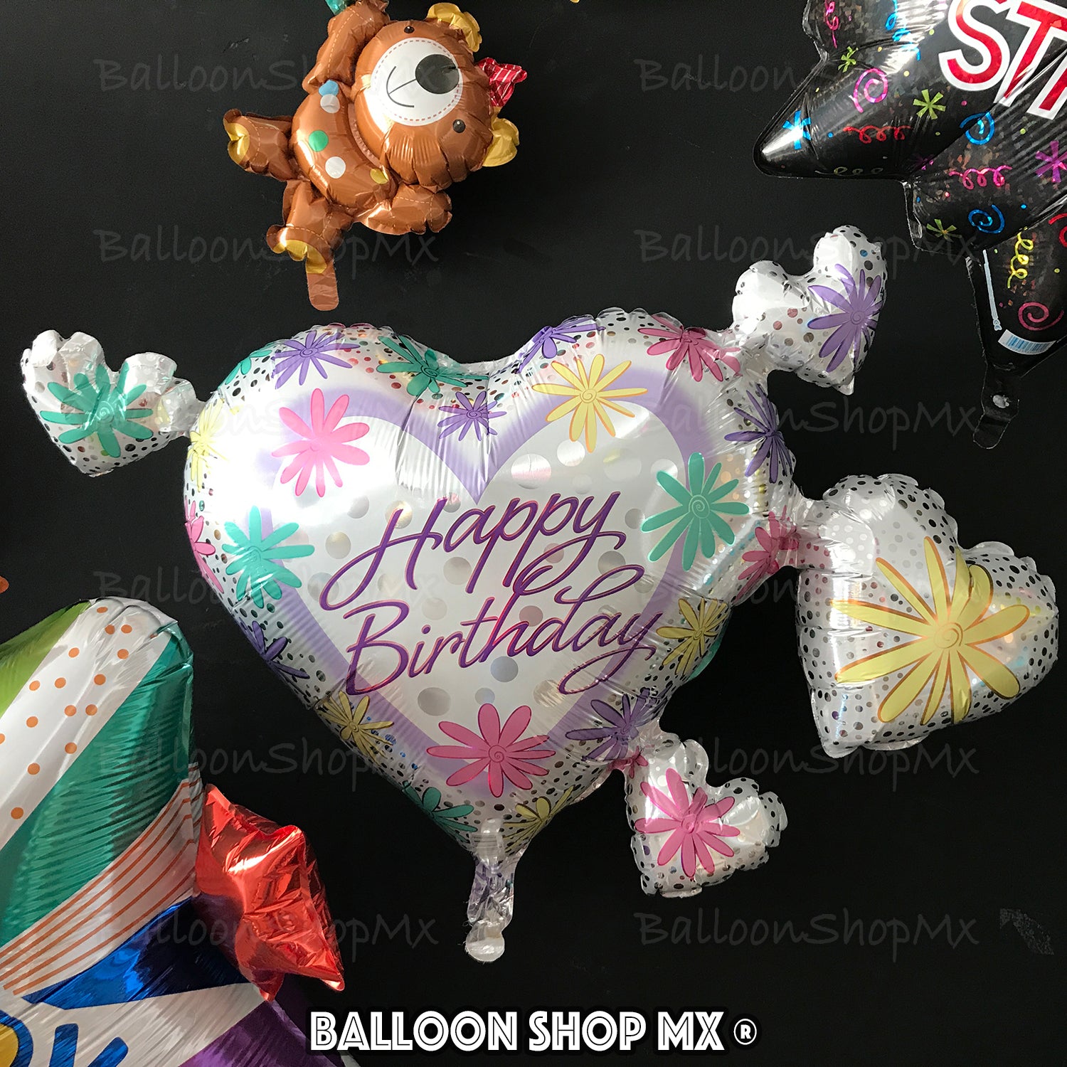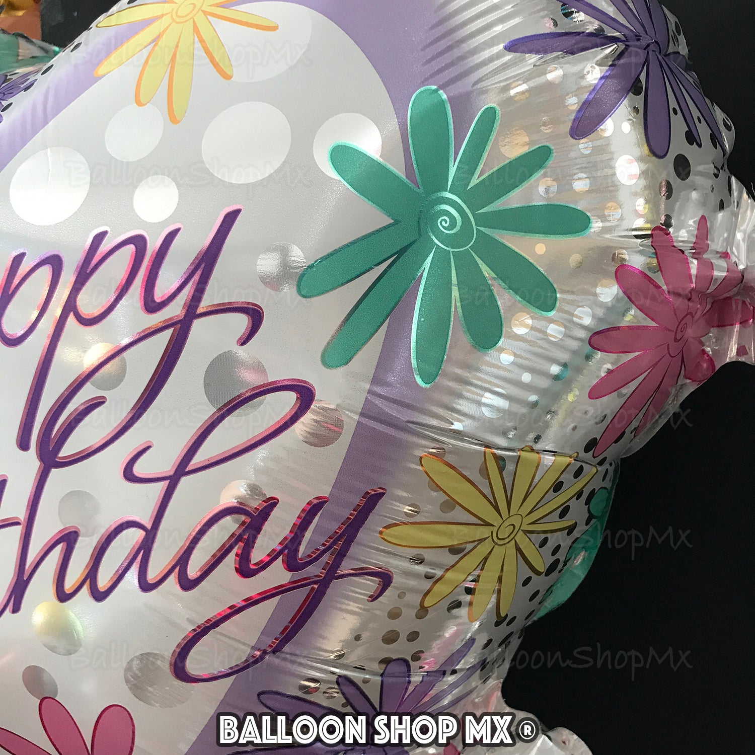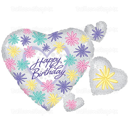 Este globo tiene un acabado cromado con vistos en colores pastel como morado, rosa, verde y amarillo. Al centro un corazón con la frase "Happy Birthday" rodeado de flores y en 4 pequeños corazones adicionales complementan el diseño.