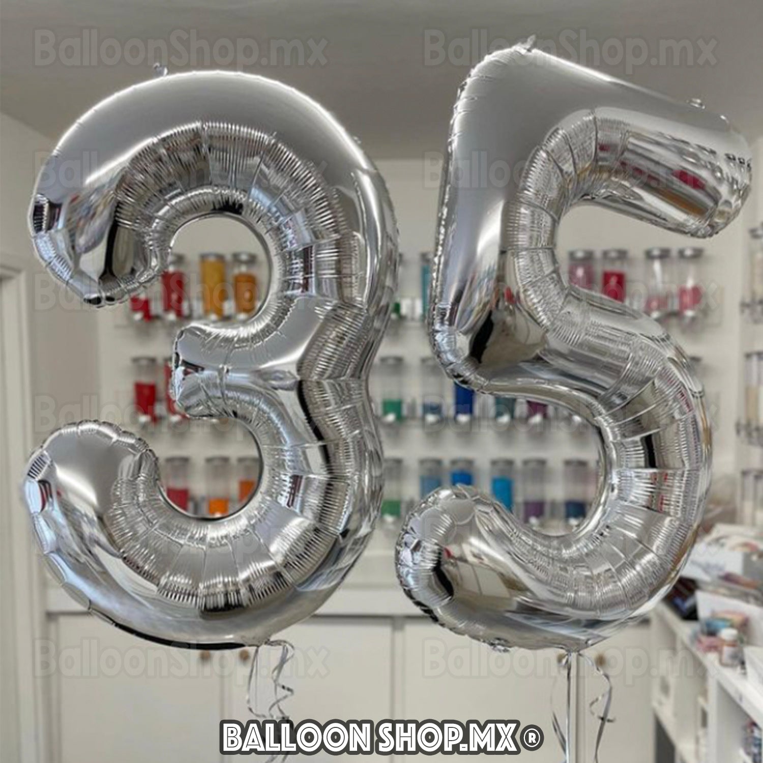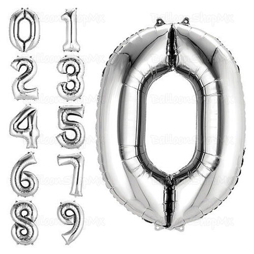 Globo grande con forma de número en color plata brillante, prácticamente espejo. Tenemos disponible del 0 al 9. En el caso que requiera dos números puede pedirlos separados o juntos, es decir para un "27", podemos entregar un 2 y un 7 como arreglos independientes o un 27 en un solo arreglo. Es importante que en área de comentarios nos lo haga saber, así como confirmarnos el número correcto, en el mismo ejemplo si es 27 ó 72.