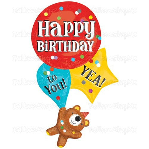 Un osito con gran nivel de detalle sosteniendo un bouquet de 3 globos con las leyendas "Happy Birthday", "to you", y "Yea!", en colores brillantes.