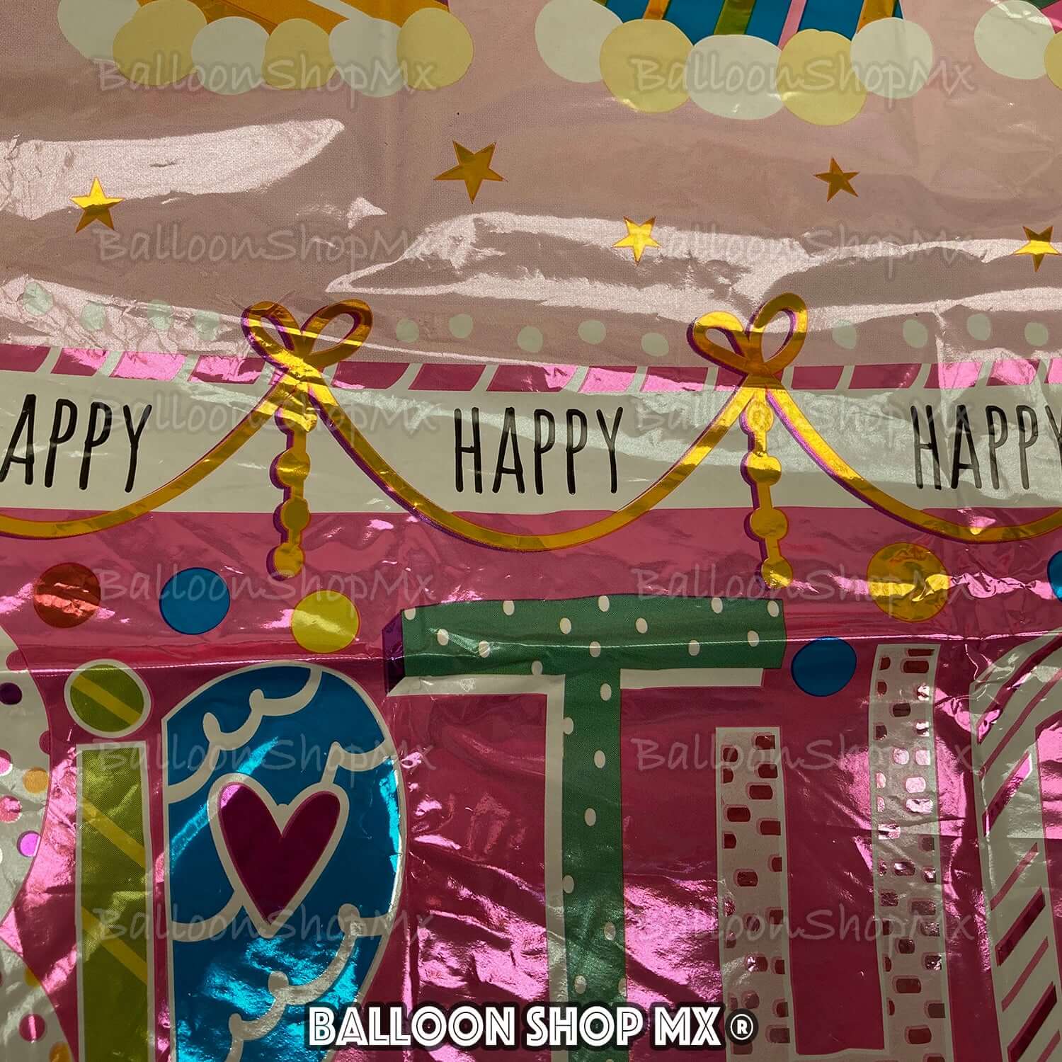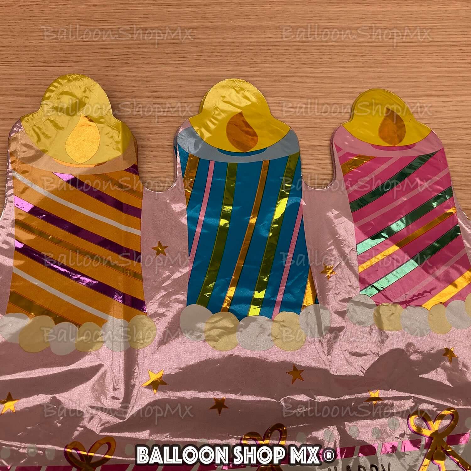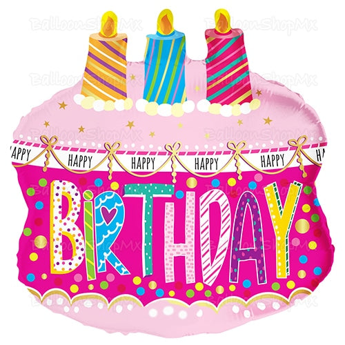 Globo en forma de pastel de cumpleaños color rosa decorado con 3 velas en la parte superior, en una franja blanca la palabra "Happy" repetida varias veces y el centro la palabra "birthday" con distintos patrones y colores.