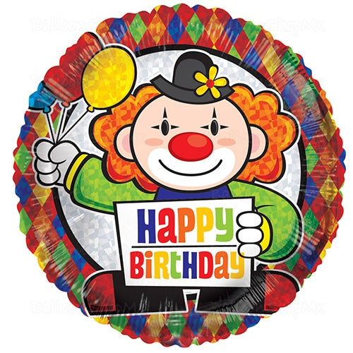 Globo redondo en acabado holográfico con un payasito al centro sosteniendo un letrero con la frase "Happy Birthday". El resto del globo viene decorado con rombos de colores.