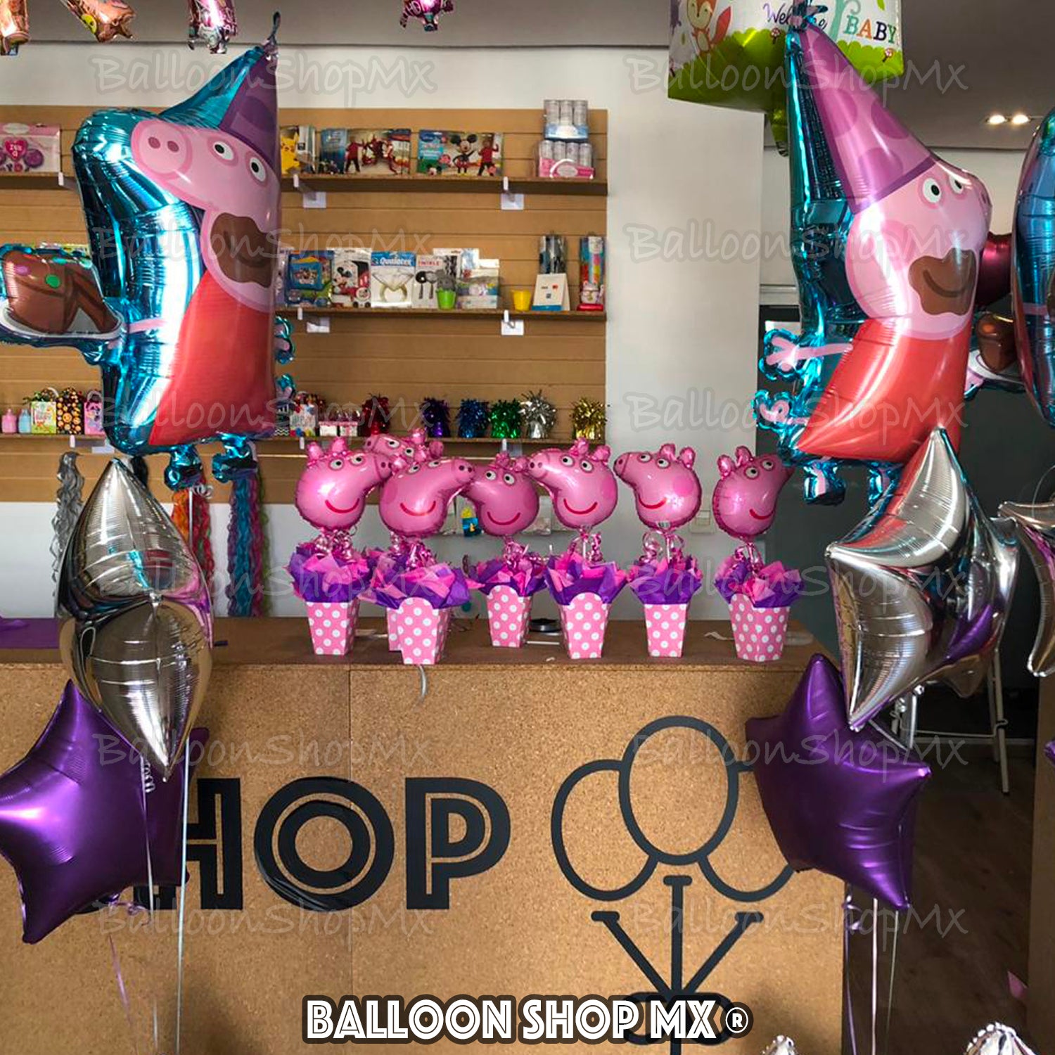 Globo con la forma del personaje Peppa Pig sosteniendo un pastelito de cumpleaños. El contorno viene en un color azul metálico.