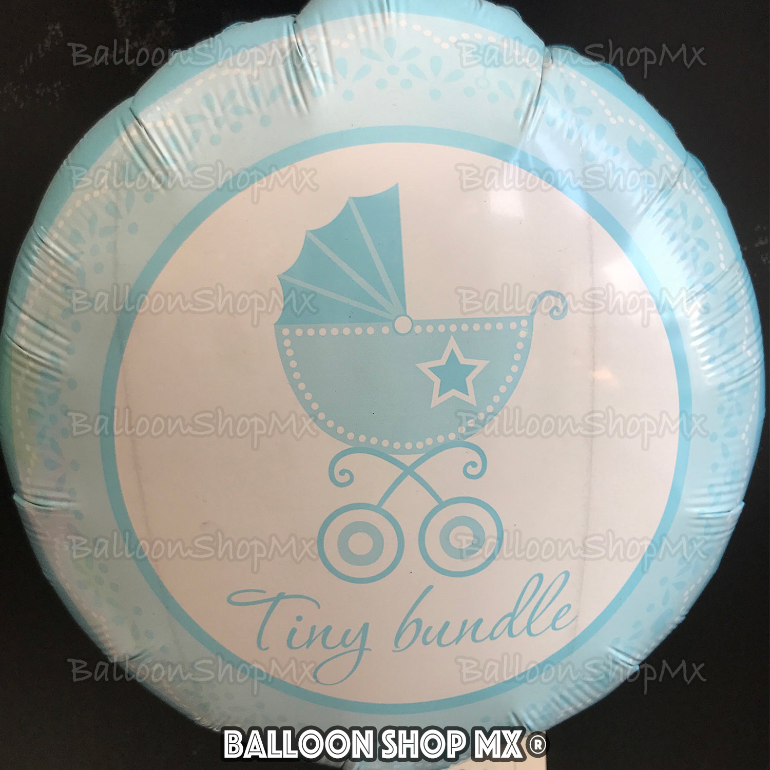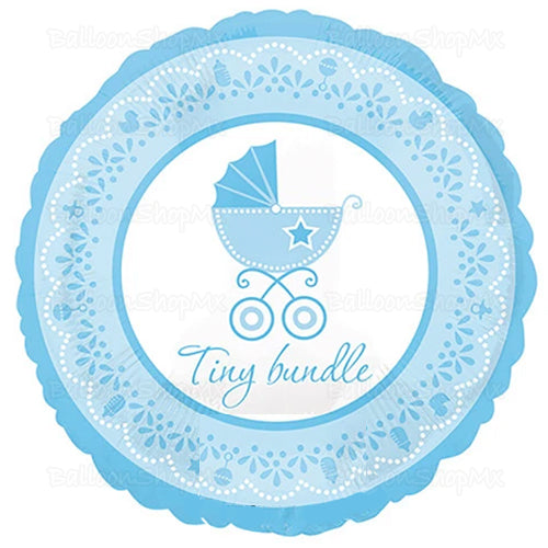 Globo de 18" redondo en color azul pastel. En el exterior esta decorado por pequeños patitos, sonajas, biberones y chupones; al centro en una marquesina blanca la imagen de una carriola azul con la frase "Tiny bundle".