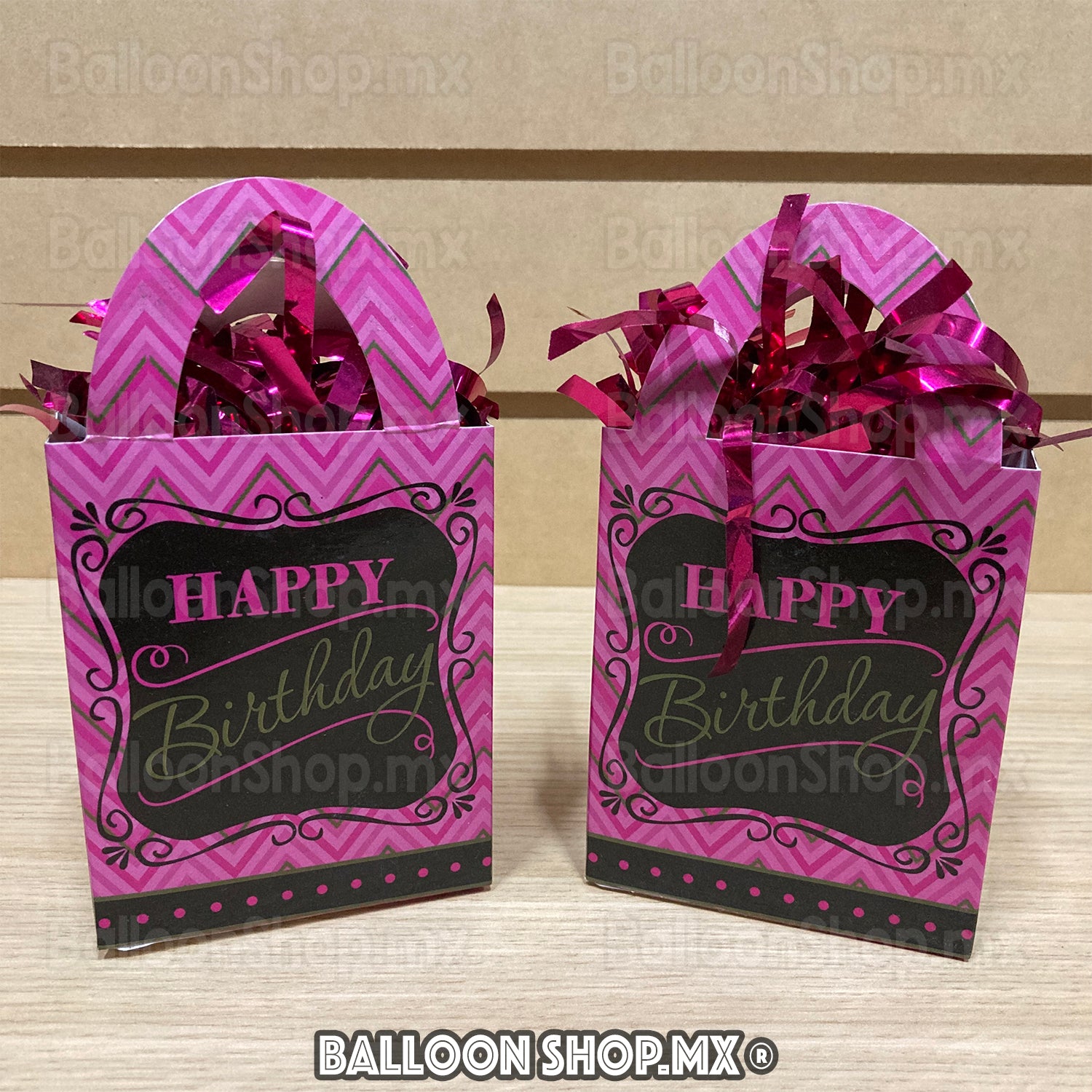 Contrapeso de mini cajita de regalo de Happy Birthday con lineas de colores rosas. Trae un pomponcito foil de colores.