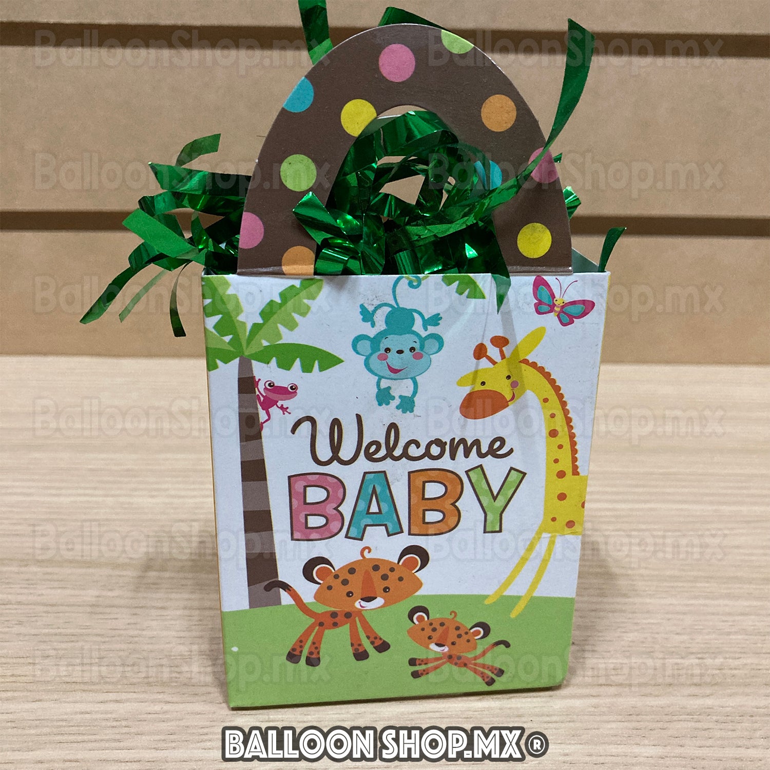 Contrapeso de mini cajita de regalo de "Welcome Baby" decorada con animalitos de la selva. Trae un pomponcito foil de colores.