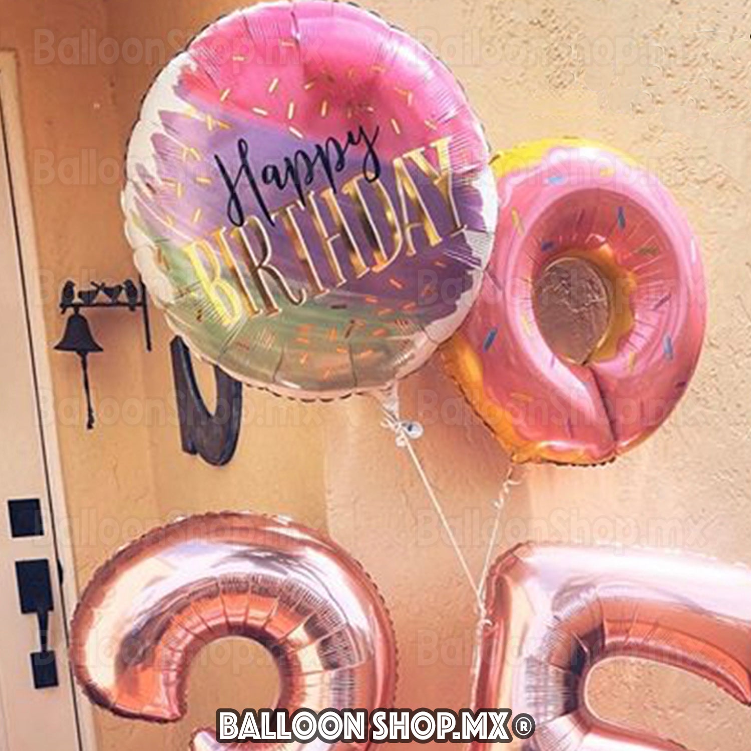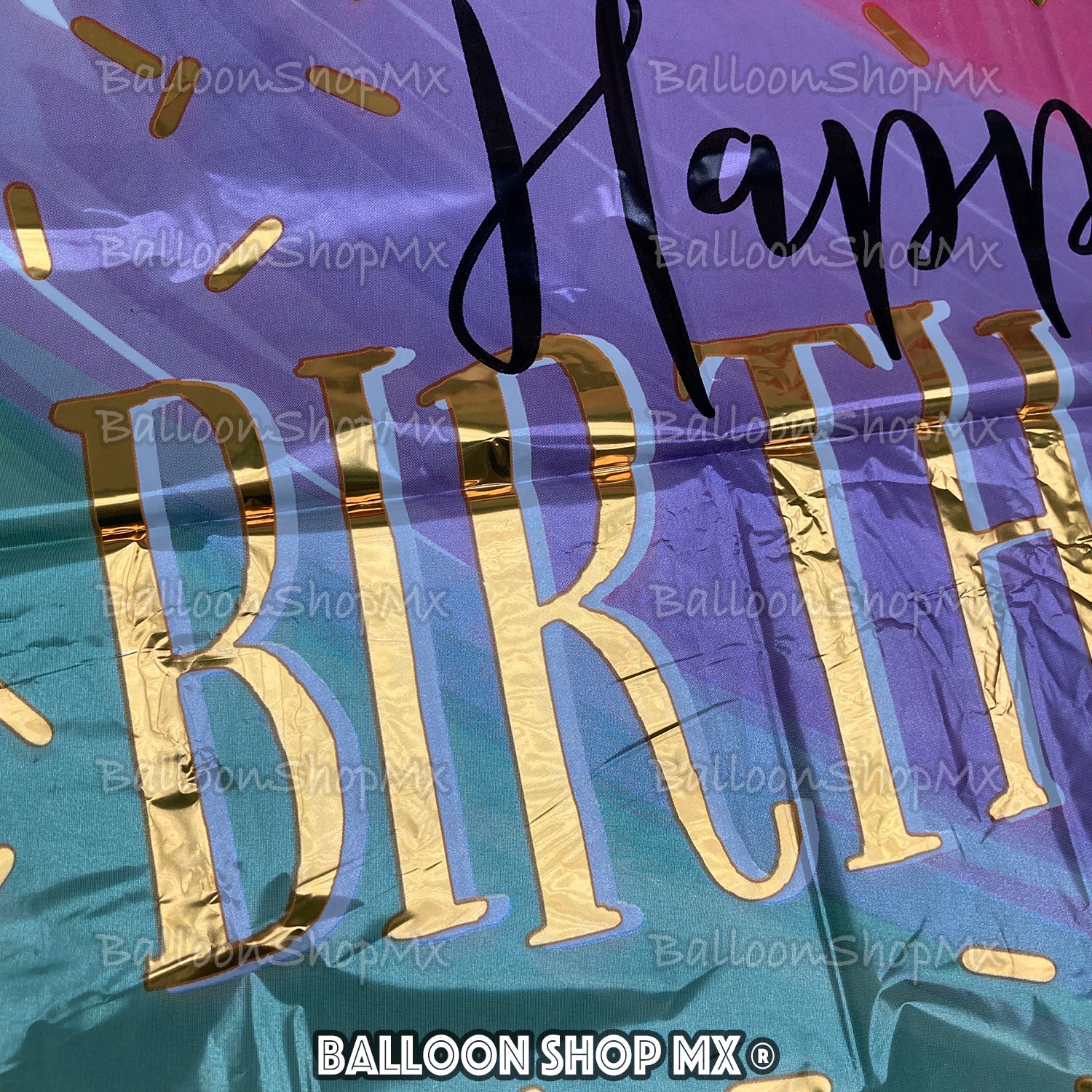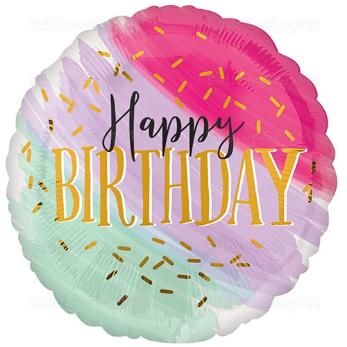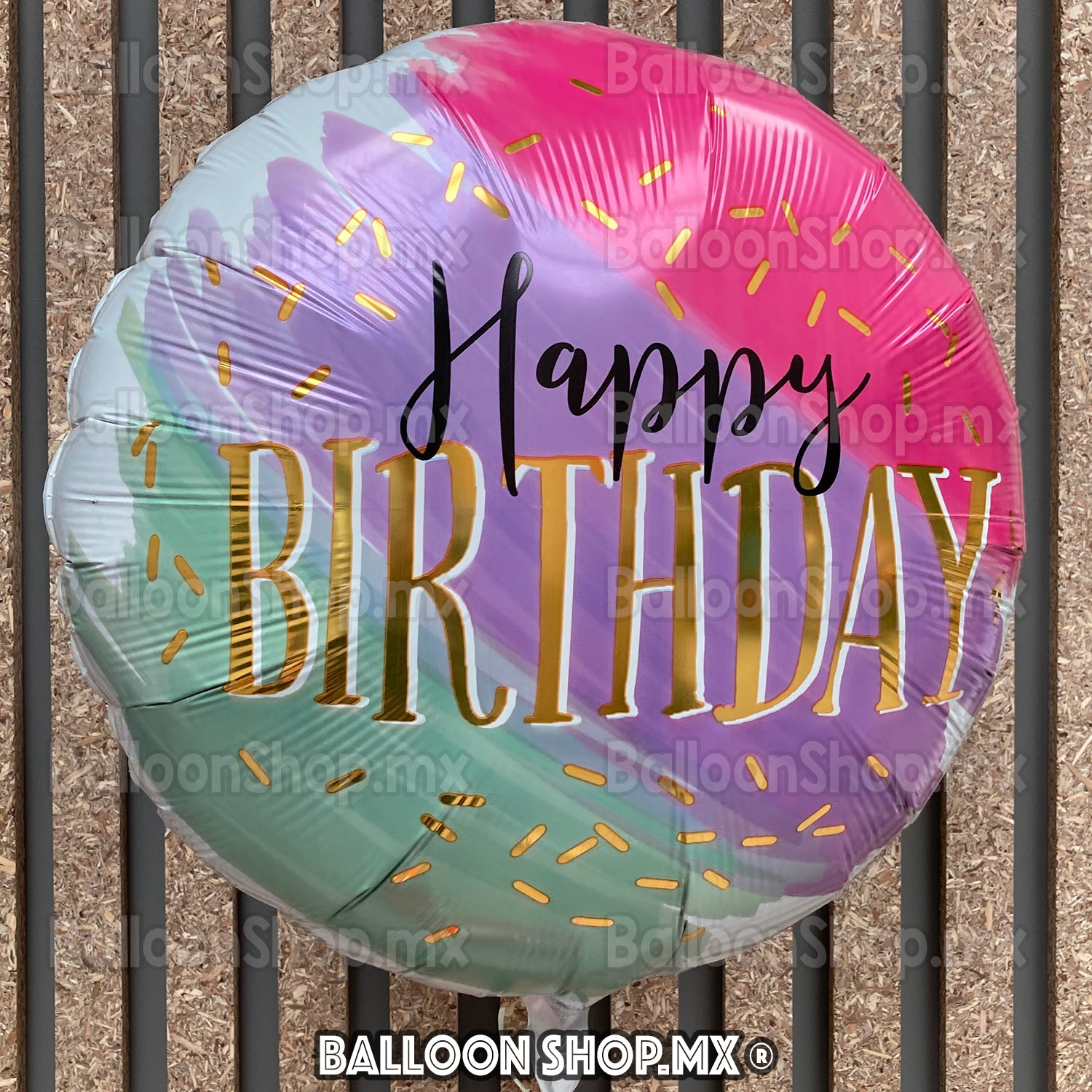 Este globo tiene un diseño muy llamativo, viene decorado con tres colores en acabado pastel (rosa, morado y menta) a manera de pinceladas con confeti en color dorado, y al centro la frase "Happy Birthday"en doble tipografía y tonos.