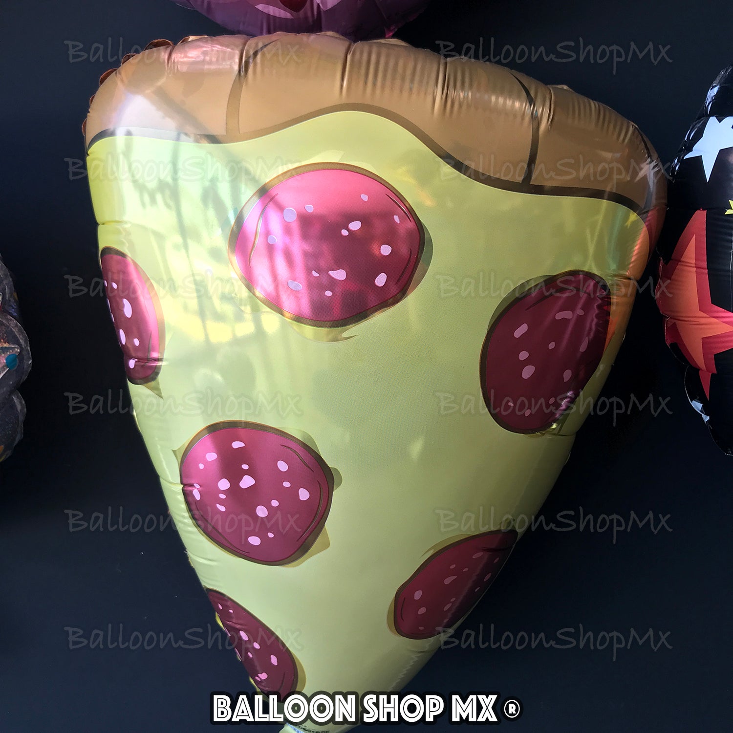 Globo con forma de rebanada de Pizza. En una cara trae una pizza y en la otra viene con el fondo rojo y la frase en color blanco "Feliz cumple and come pizza".