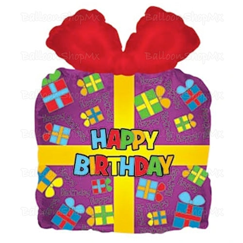 Globo con diseño de caja de regalo. Tiene un color morado metálico, bandas color amarillo y al centro la frase "Happy Birthday", el remate es el moño rojo en la parte superior del globo. El resto del globo viene decorado con un collage de cajas de regalos y frases Happy Birthday.