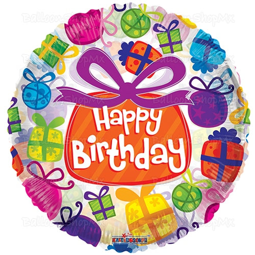 Globo redondo transparente con impreso de cajas de regalos de distintos colores y tamaños. Al centro trae una caja de regalo color naranja con la frase "Happy Birthday".