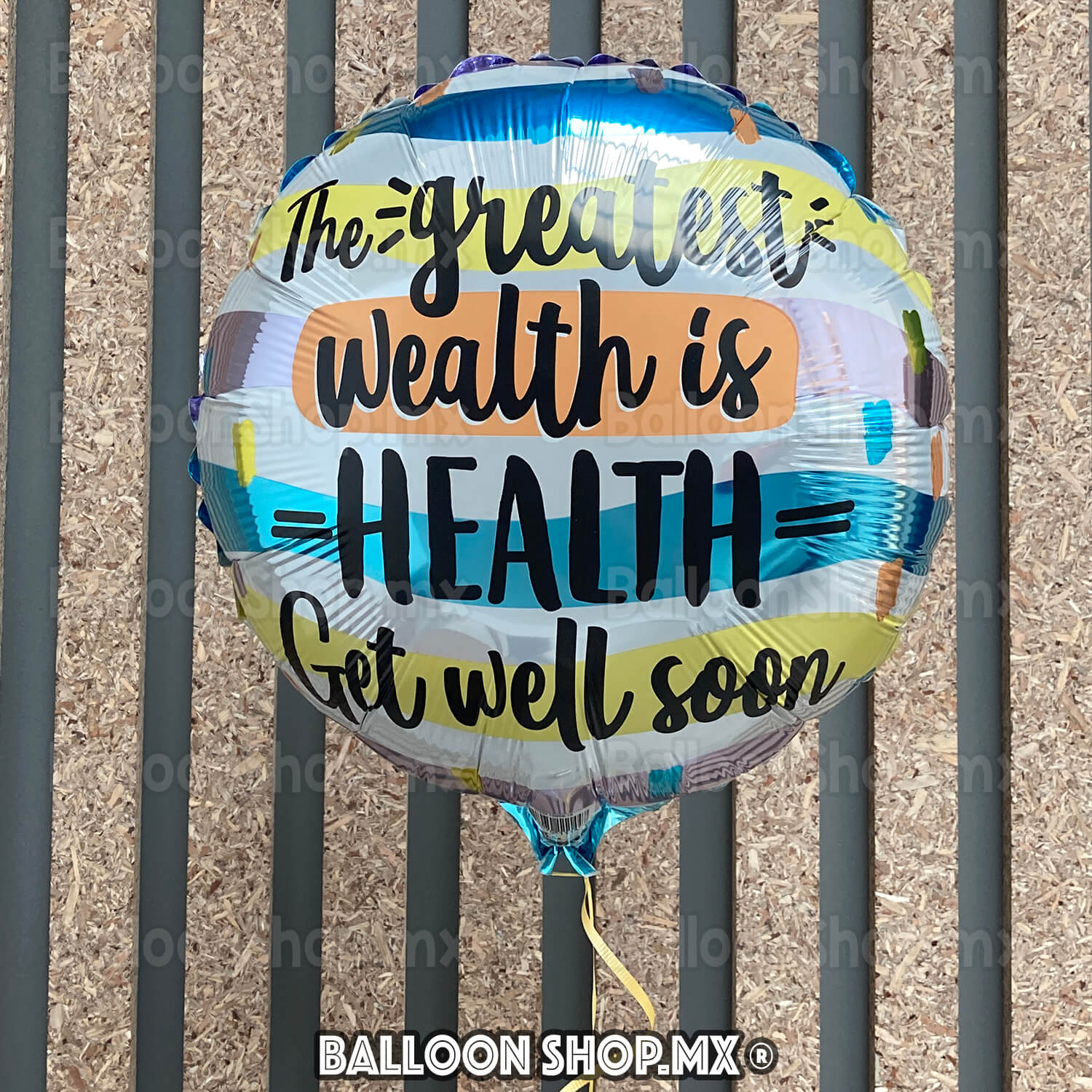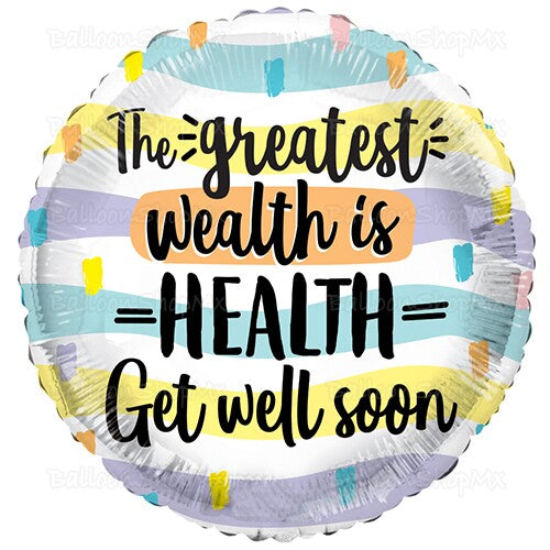 Globo redondo con colores blanco, lila, menta y amarillo al fondo, decorado con la frase "The greatest wealth is health. Get well soon".