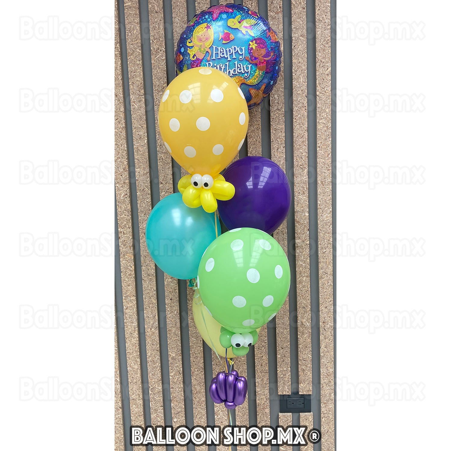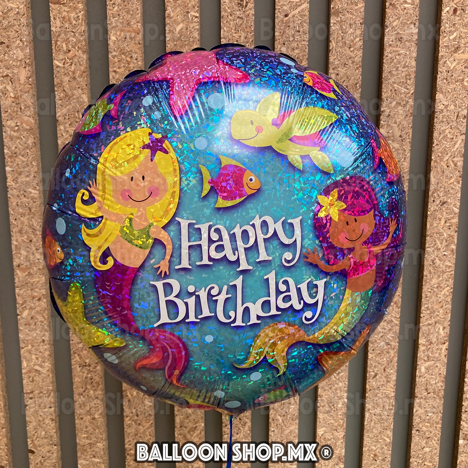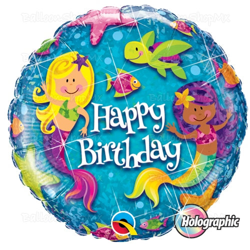 Globo redondo en acabado holográfico. Viene con dos sirenas y al centro la frase "Happy Birthday". El resto del globo viene decorado con distintos elementos marinos como tortugas, peces, estrellas, etc.