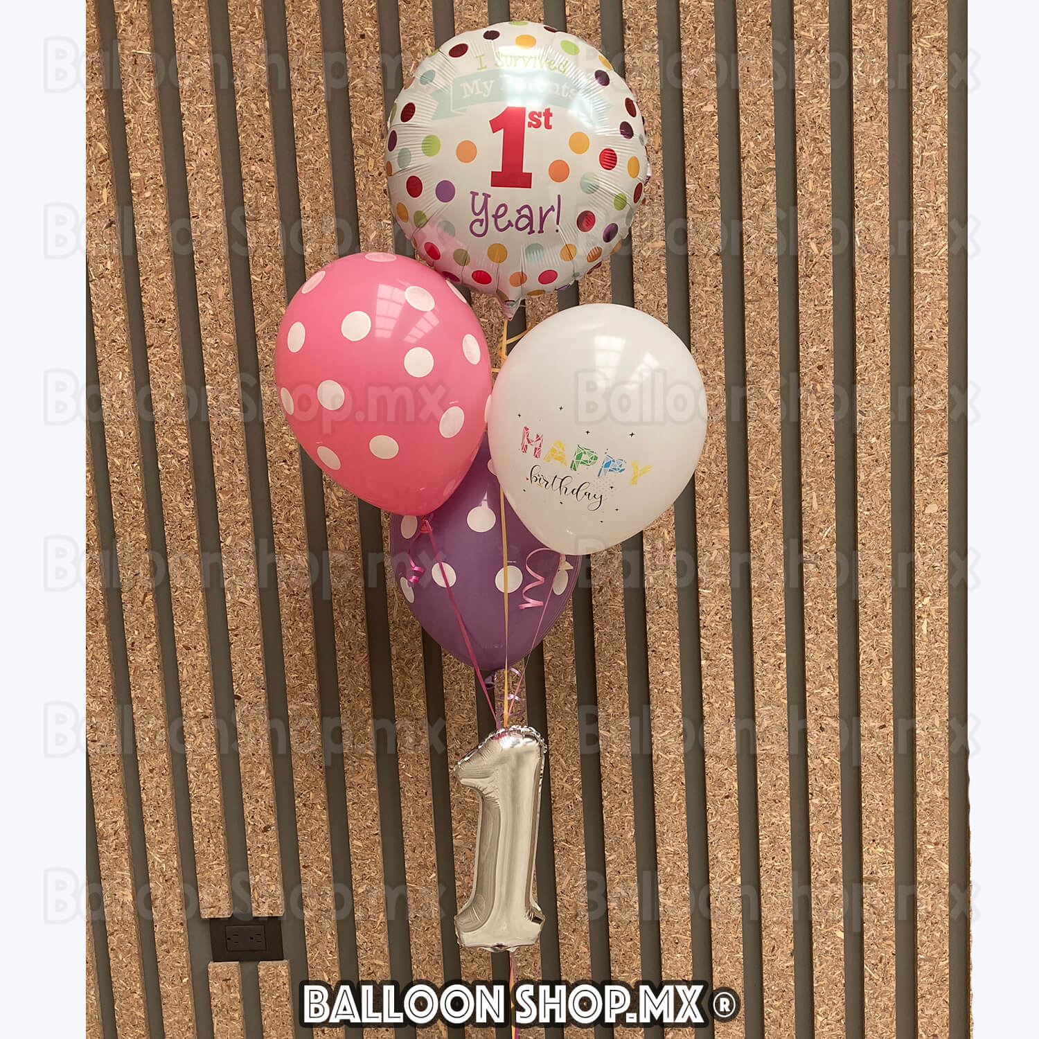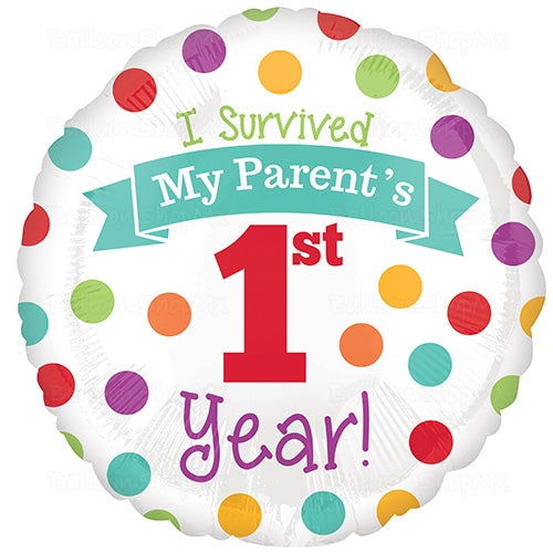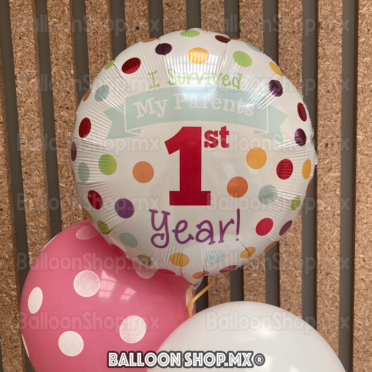 Globo redondo de color blanco decorado con círculos de colores, al centro la frase "I survived my parent's 1st year!". Este globo es estupendo para el primer cumpleaños de papás primerizos.