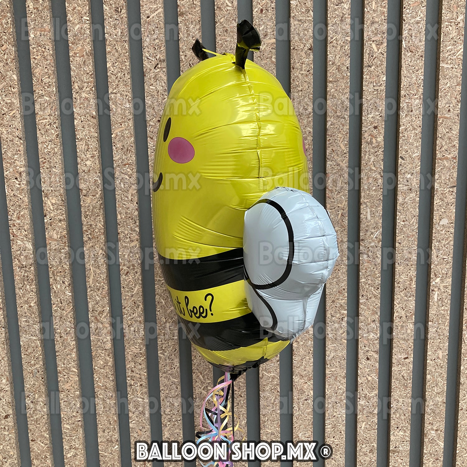 Globo grande con forma de abejita para Baby Shower, fiestas de revelación de género o para anunciar un embarazo! La abejita viene en forma tridimensional, con diferentes anchos para las antenitas, cuerpo y la alitas. Entre las rayas en el cuerpo viene la frase "What will it bee?".